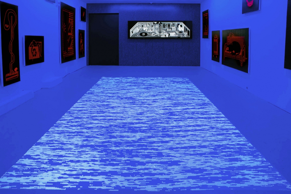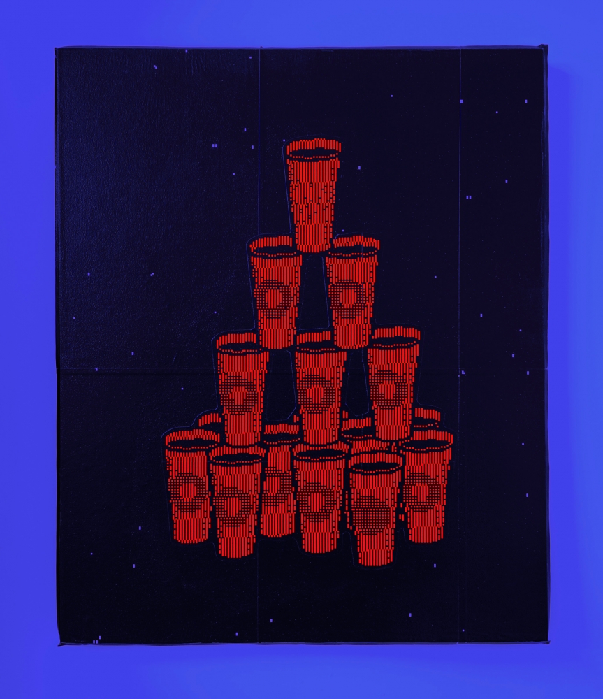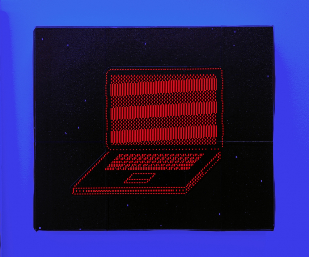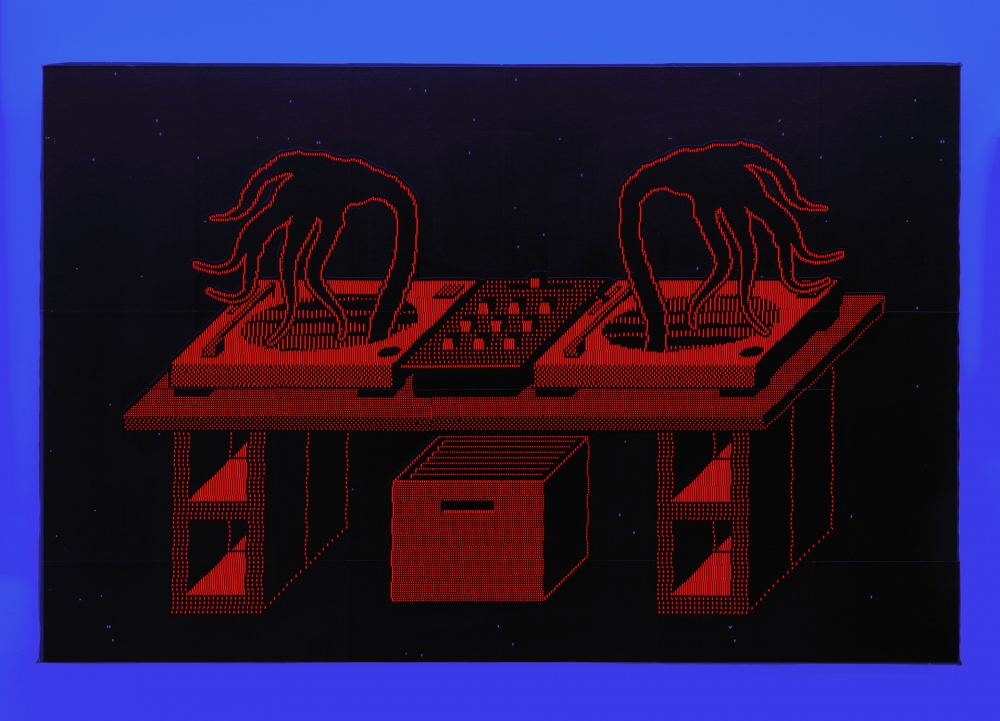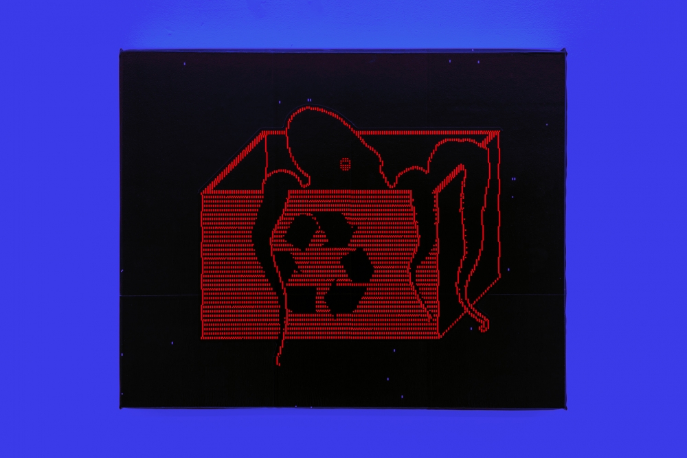 Sassoon explores the aesthetic relationship between pixel and screen, “reflecting on their entanglement and materiality by constraining himself to experiment with pixelated patterns and figures as its sole visual language.”**