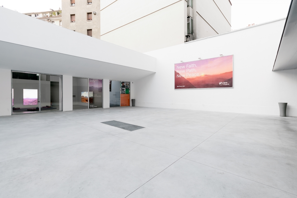 The large glass windows of Milan’s Spazio Maiocchi reveal a space that elicits the severity of a laboratory experiment along with the seductive appeal of a futuristic travel agency: it’s sparse, clinical, and above all corporate. Timur Si-Qin’s solo exhibition, Campaign for a New Protocol, running April 18 to May 18, is the third installment of a series celebrating a technology-based occultism, a “secular faith.” The New York-based artist, of German and Mongolian-Chinese descent, introduces the concept with a large billboard at the gallery’s courtyard entrance. A slogan that reads, “New Faith, New Path, New Peace” is overlaid onto an image of a desert cast under a dreamy, majestic sunset.