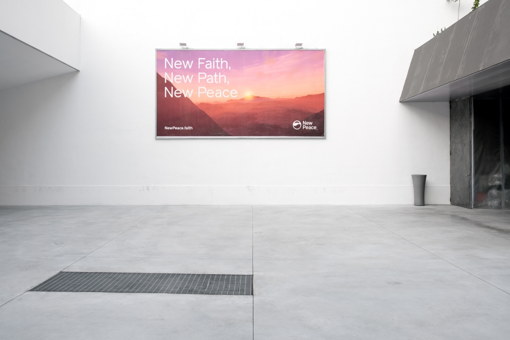 Buddhist author D.T. Suzuki once famously claimed that the dualism latent in anglophone culture prevented Americans from fully grasping the meaning of Zen. The assault of links and logos in Si-Qin’s online manifesto may prevent a similar block to “New Peace,” even if they claim to offer some form of access. The mysticism remains in what a new religion that is compatible with, even dependent on, the language of the modern marketplace might entail. Regardless, the language and the visuals are alluring. The suggestion is that the calm artificial landscape pervading the space refers to some “new orientation to the world” and a “new sense of spirituality for today and the future.” It might not exactly evoke a substantive reorientation in our concept of faith, but it does invoke a feeling of wanting to get there.**