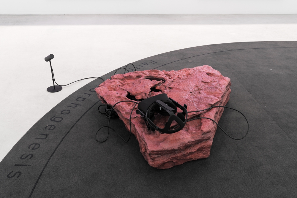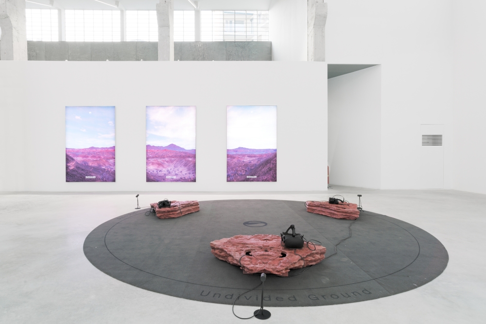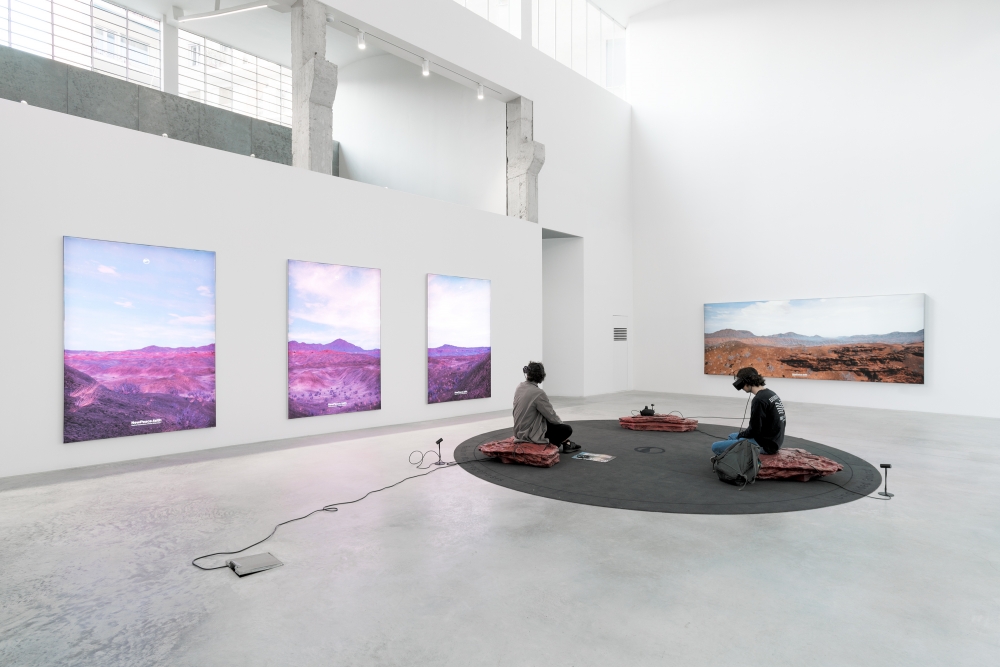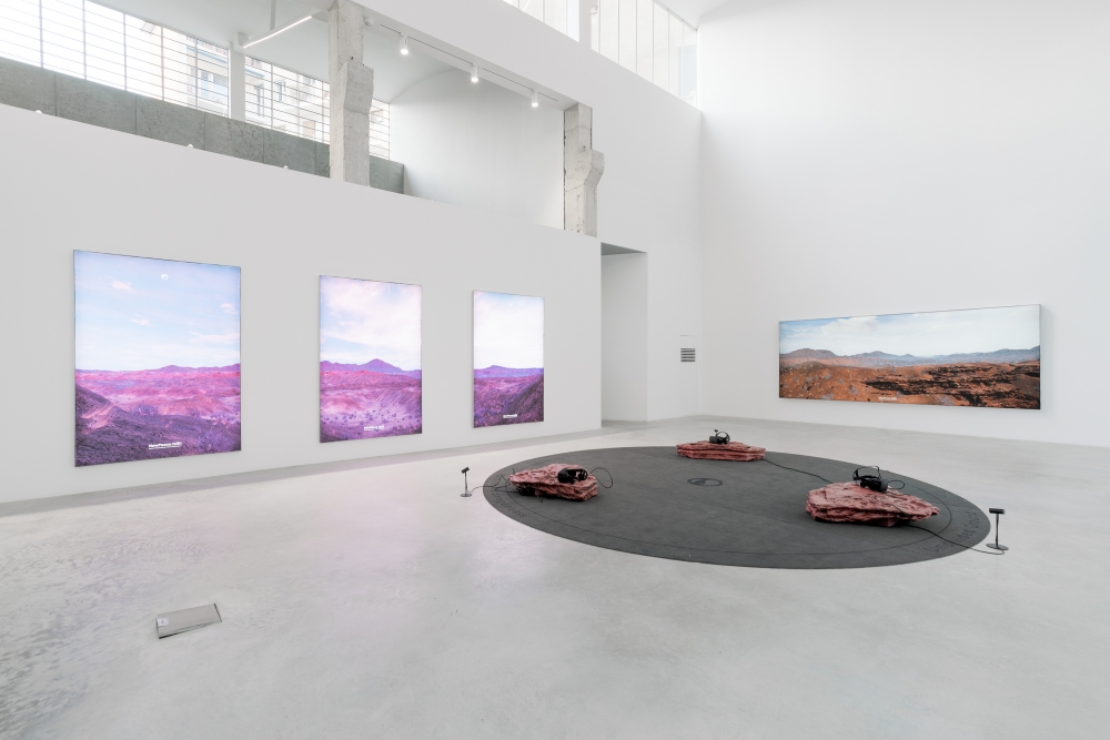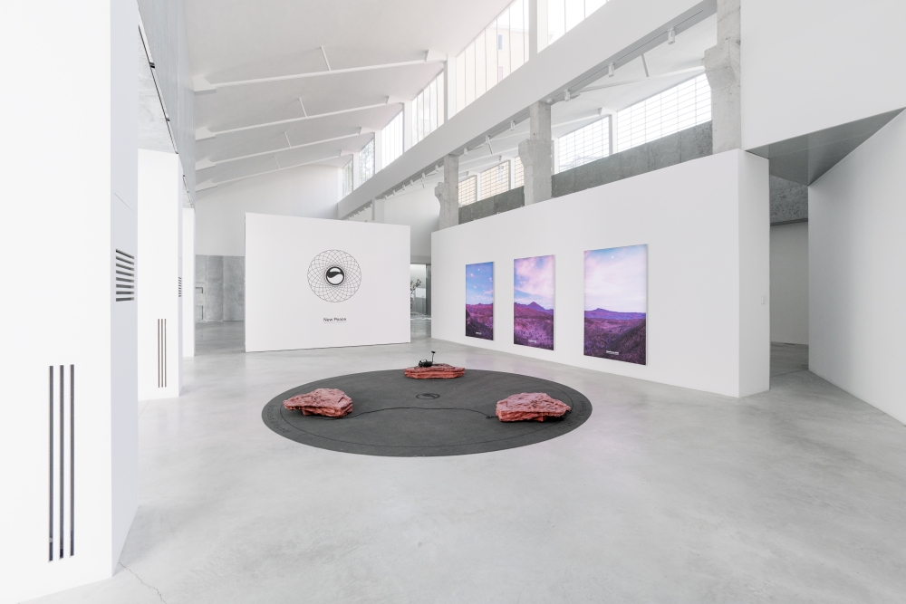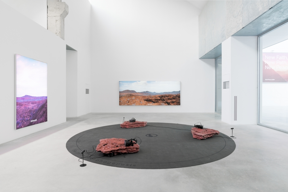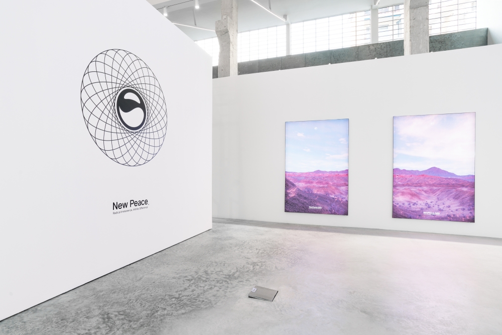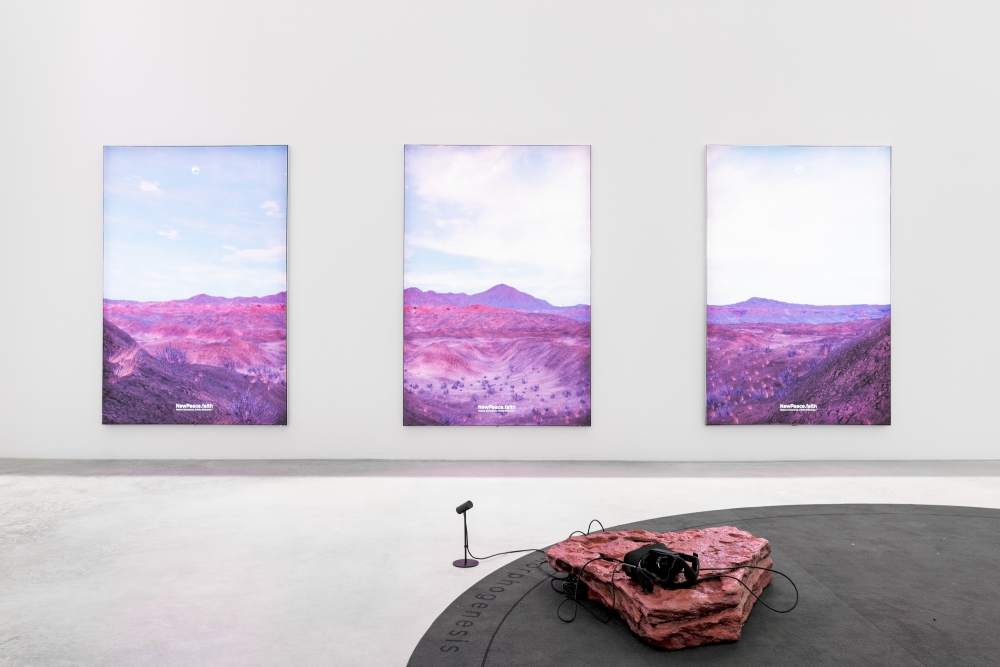 Within the gallery itself, a series of three identical light boxes illuminate the scene of a hazy desert vista. On the floor, three artificial rocks are placed on a large circular mat in a triangle formation. Virtual reality headsets are placed on each one, inviting the viewer to explore a 3D version of the showcased landscape. The images on the walls could easily pass for the countless travel ads in the arrival halls of almost every airport, teasing tourist fantasies of rolling green hills, or shimmery wheat fields. But unlike these scenes, Si-Qin isn’t just selling a sense of place, but an entire ideology. At the bottom of each display a hyperlink, NewPeace.faith, directs visitors to a site containing a downloadable white paper that expounds the artist’s ideology.