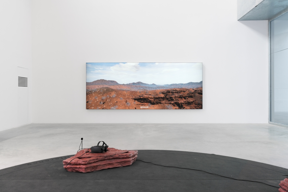 “New Peace” is part of Si Qin’s overarching reach for a non-dualistic understanding of spirituality—one that doesn’t adhere to any concept of divinity, but finds its basis of devotion within the real, physical world. He writes, “New Peace rejects transcendent planes, supernatural realms, or eternal essences because our universe of infinite creativity is sacred and mysterious in and of itself.” But theVR tour of the feverishly-advertised desert region is perhaps a subversion of this dualist “rejection,” offering a grounded and forceful tranquility through digital renderings. They are neither earthly nor martian in origin, lacking any referent to a tangible place. The realization invokes a feeling of a cruise-controlled surprise. You feel sold, though you don’t know what you’re buying.
