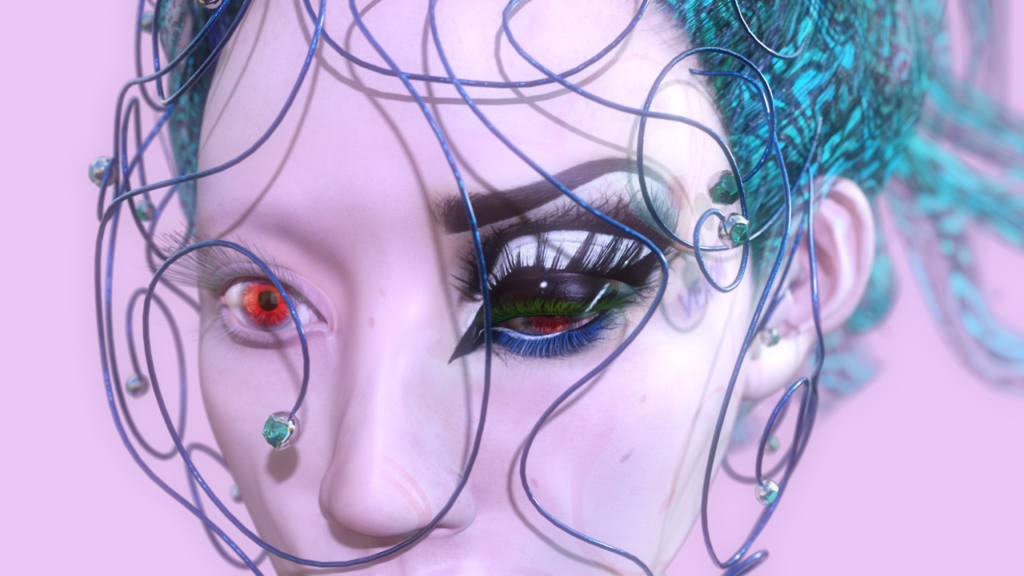 A visual artist as well as a DJ, Wang NewOne’s surreal artworks often focus on polymorphic, androgynous, humanoid forms covered in wires and sporting mechanical eyes.; Tthe viewer is presented with fantasies of a pleasant, colourful future with glistening, playful monsters, beautiful robot life and bountiful vegetation. The inquisitive and unthreatening characters in her videos are as interested in us, as we are in them. As well as creating posters and artwork for China-based DJs and producers, in some videos, the connection to nightclubs is made more explicit. At the end of a recently-released unnamed video collaboration with fashion Instagrammer xanthousebae, the screen flashes black and uranium-green in time to the video’s four-by-four bass soundtrack. There are clear links to the sickly-sweet DJ sets that Wang NewOne performs with the accompaniment of her visuals, which veer between the thumps of trap bass and high-pitched Japanese and Chinese vocals.