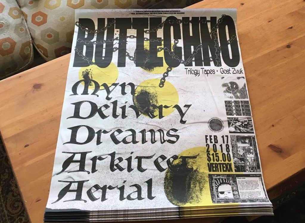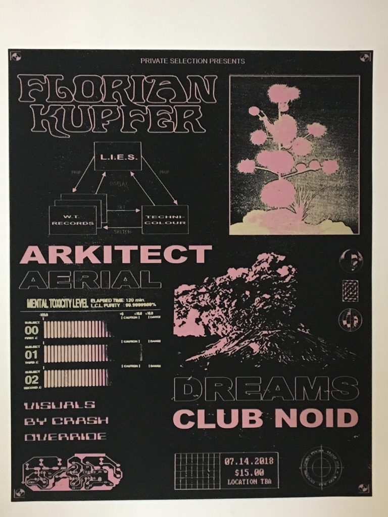 **Along with Lee Gamble, Buttechno, NGLY and Tzusing, Florian’s the latest artist who’s had physical posters printed for a Private Selection show. One thing I’ve always noticed in Europe, Berlin particularly, is the omnipresence of flyers emblazoned on walls and lampposts. Here in LA, promotion and flyers are almost strictly relegated to the digital realm.