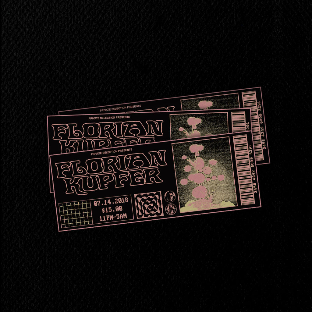 Private Selection is realistic about their label’s presence on social channels and online ticketing sites for parties — but they don’t waive their self-subsistence either. Ronneberg developed an alternative ticketing system on the website. Most importantly, the label defends the tangibility and agency of the printed party flyer, which Pimenta designs. Private Selection prints and sells these flyers to attendees as souvenirs. The party’s latest iteration on July 14, which saw L.I.E.S. Records affiliate Florian Kupfer headline, even handed out corresponding collectible tickets to the first 100 guests, referencing an item largely replaced by a smartphone barcode.