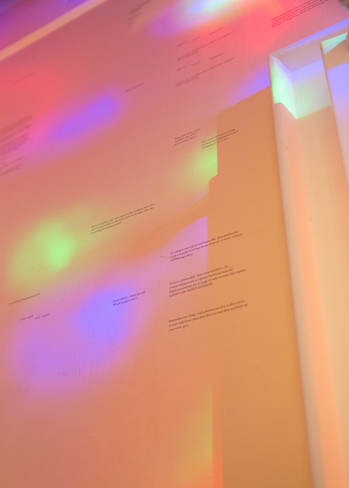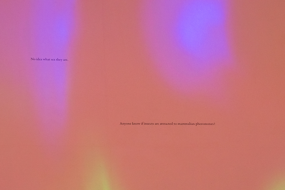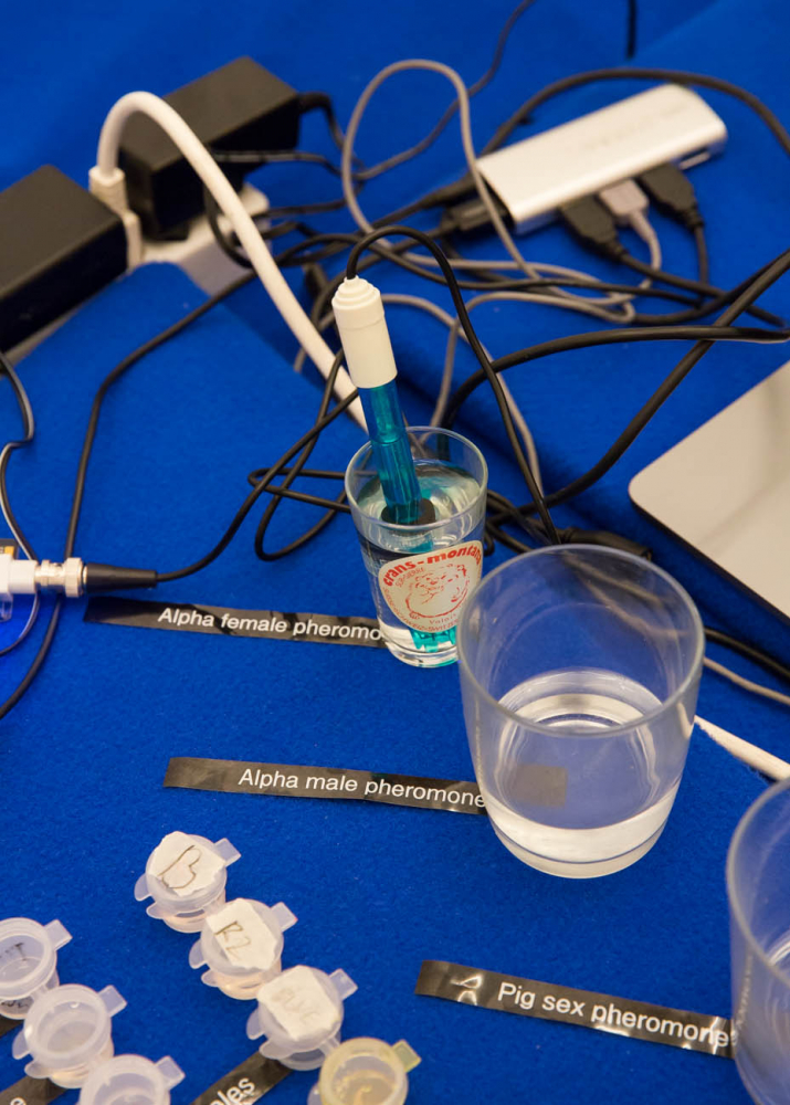 In the show, visitors’ bodies were implicated and engaged with pheromone scents, lighting and sound. The artists’ keen interest in the biological effects of pheromones asked questions about our lived experience: