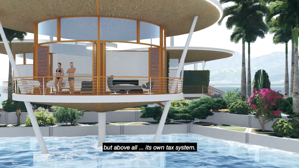 When questioned by writer Brendan C. Byrne in Rhizome, Hurwitz-Goodman expressed fascination with Seasteading Institute’s new cut of the film as it supposedly highlighted the meaning of subjectivity inherent in any documentary.  The question of subjectivity in montage, however, only seems to touch the surface of the dilemma here, because the two films are ultimately not radically different from one another in their slick advertising aesthetics. This fetishizing style of post-internet art not only displays a proximity to corporate tastes, but in this case becomes actual advertising for the Seasteading Institute.