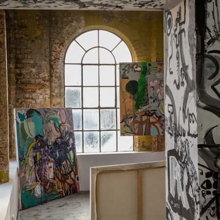 Painting Clubb in collaboration with Chaos Magic and artists Jack Cooper, Georgia O’Reilly, Leon Sadler, Jeffrey Alan Scudder (2018). Exhibition view. Photo by Julian Zizko. Courtesy the artists + Chaos Magic, Nottingham.