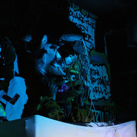 Scrabulous Anomaly in the Re-Write Department (Alexis Milne) with Jim Osman as Hooper The Intern, at ZINOMORPH (2018). Performance view. Photo by Christina Cushing. Courtesy the artists + Chaos Magic, Nottingham.