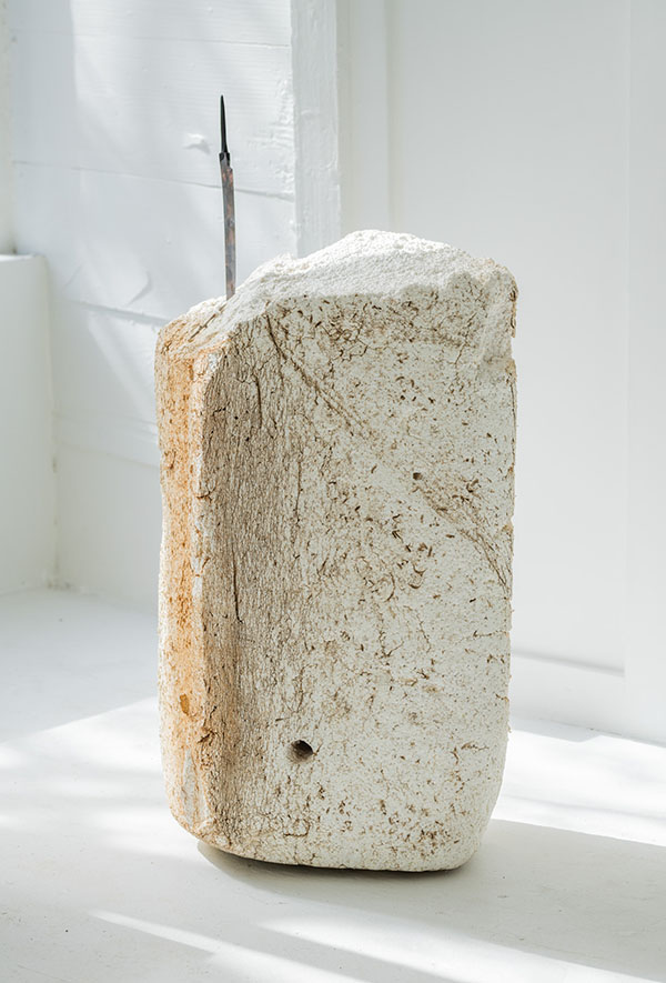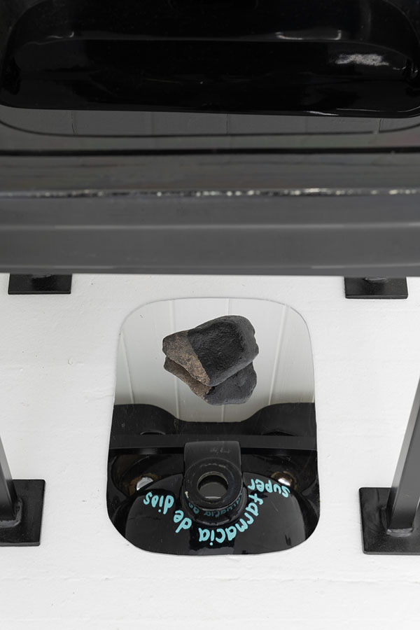 The found object sculptures give off spiritual vibes. ‘Untitled’ (2019) made from styrofoam, sand, steel, thermoplastic rubber is a pun on the legend of British King Arthur and Excalibur: a waterlogged hunk of styrofoam is pierced by a blade which o’neal forged at OCAC, branded along the dull edge with the exhibition title. Despite seeming like a very heavy object, it’s actually extremely light, apt to tip over at the slightest touch. On the other end of the spectrum, ‘meet cute 3: super farmacia’ (2019) is physically heavy but feels airy, like an altar that found its way here from another planet with different gravity. A black sink rests on a powder coated black steel stand with four legs. Plexiglass rests in the sink basin, a pun on water, and down below a mirror talks back, revealing the piece of obsidian that rests on the mirror, and the text painted under the sink (“super farmacia de dios”).