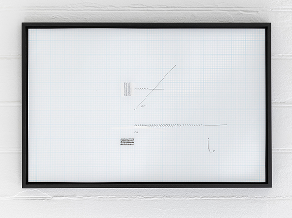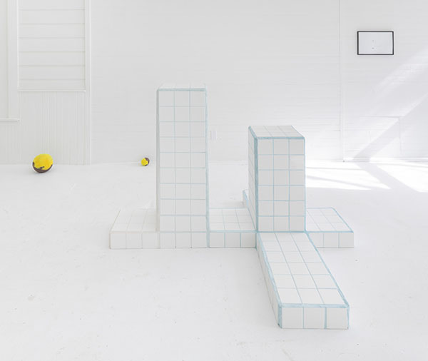 Building on these gestures of accumulation and iteration explored through primary shapes, the works on vellum draw on asemic mark-making practices to produce an experience that blurs the line between reading and looking. At moments they register as graphic scores, at others, like abandoned architectural plans. Virtuality here is a litmus for struggle, not so much a stand-in for a nostalgia as a reminder of the technical limitations of the mind to comprehend space and time. The gridded vellum paper of the hung works rhymes with the central object in the show, ‘FOR I WAS AN EDIBLE YOUTHFUL LIFEFORM WITH DREAMS OF BECOMING GRITS’ (2019), in which the artist covers a heavy wood structure with tile and joint compound. Almost like mold, a light blue acrylic on the joint compound begins to creep into the grid lines, coming to fruition at the second ‘tower’ of the work, which looks like the top half of a 3D cross. This work is the titular square tree, the font from which springs the show’s and the hermeneutics of refusal. The grid reveals itself as always already wonky and tragicomic, a CGI render constantly in-process.