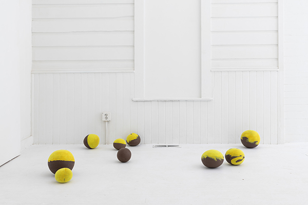 The show includes three kinds of work: drawings with ink, conte and wax crayon on grid vellum drafting paper, found object sculptures, and unglazed ceramics. The latter o’neal produced as part of their residency with the ceramics department at the Oregon College of Art and Craft (OCAC), utilizing the clay waste of other practitioners. In ‘even if you’re not playing, i’m gassed to see you in the world’ (2019), greenware (clay which has been shaped but not bisque fired) is stacked on a floor vent in five off-kilter piles, two of them topped with rotting citrus. A forlorn rag of raw silk is wrapped around one grille section. The other ceramic work consists of fired red and dark brown hollow spheres coated with lime-yellow nylon flocking– an accretion of small, loose microfibers. While a cursory glance indicates sports balls, a closer look reveals imitate natural objects: these are virtual moss-covered rocks, from the world of the titular square trees, and somehow they have “broken through” into meatspace.