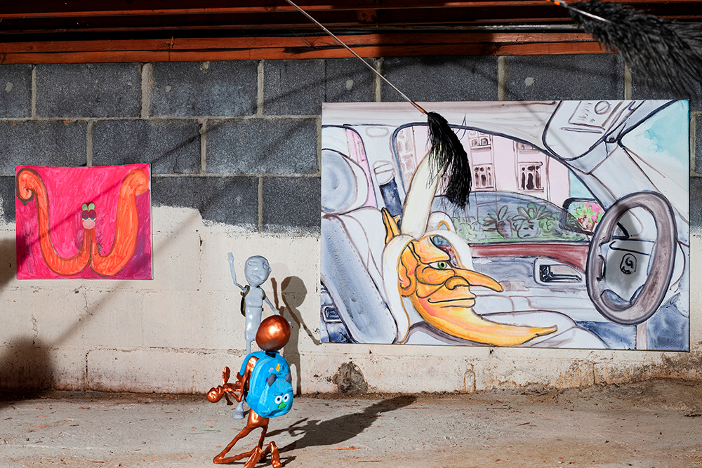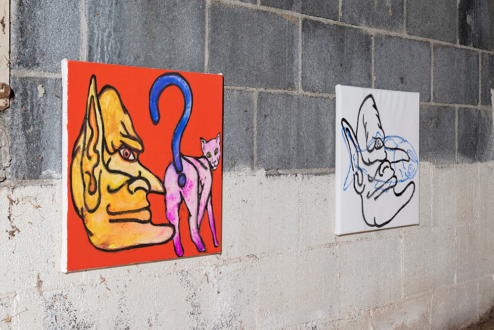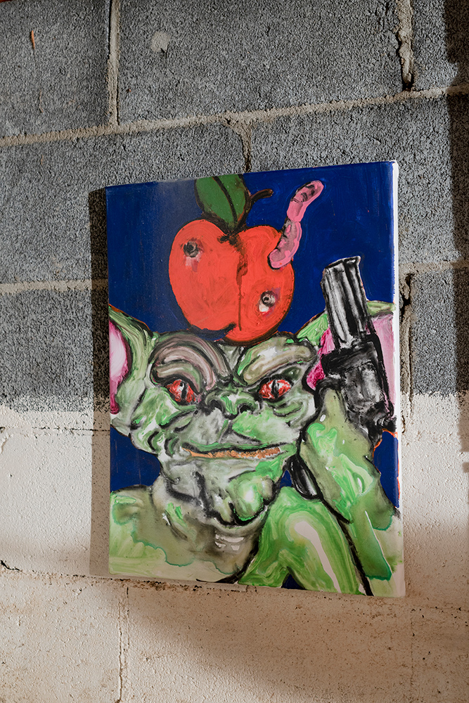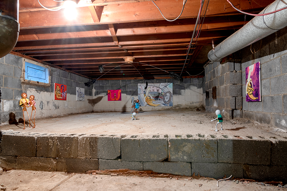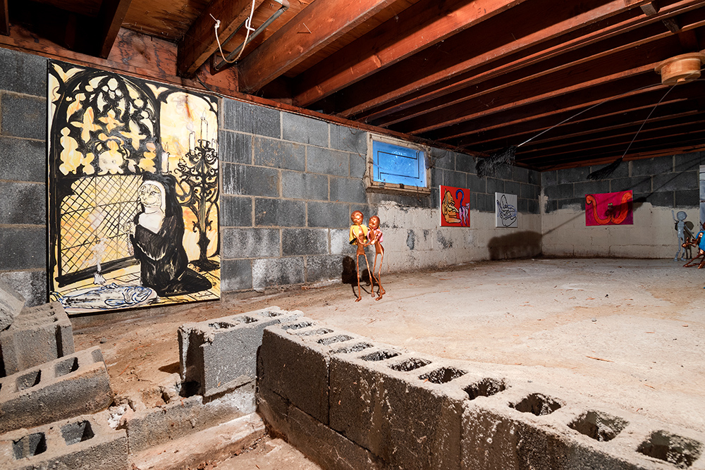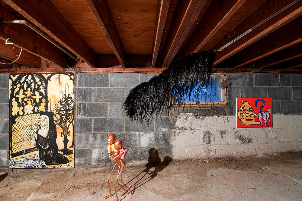 The show situates paintings and sculptural works in a loaded site for artist and project space founder Hinge: darkZone is located in the basement crawl space of his New Jersey family home. Along the walls Hinge’s colourful figurative paintings bring to mind schlocky trash films and pulp pop culture, while the cellar is populated with the distressed figurine sculptures of Sargent, along with Sullivan’s kitsch ceiling fan installation. The works in kissed by profane grace play to the space’s feeling as a site for childhood retreat into skewed imagination.**