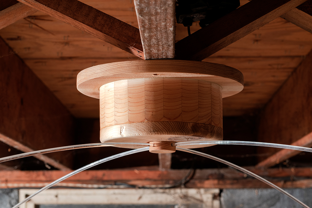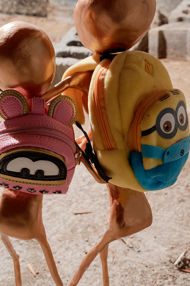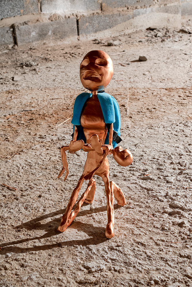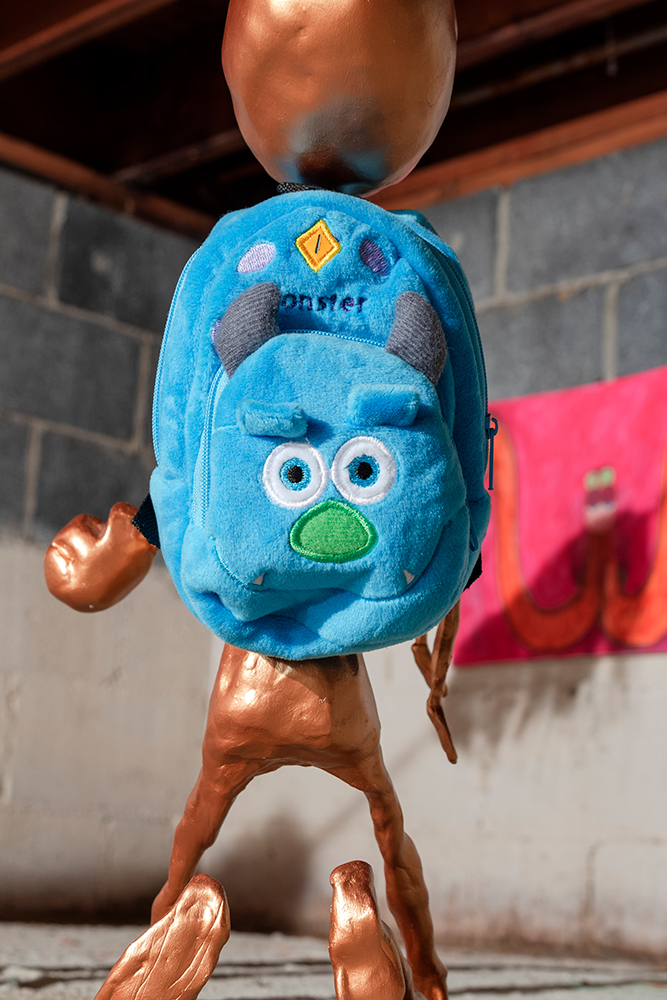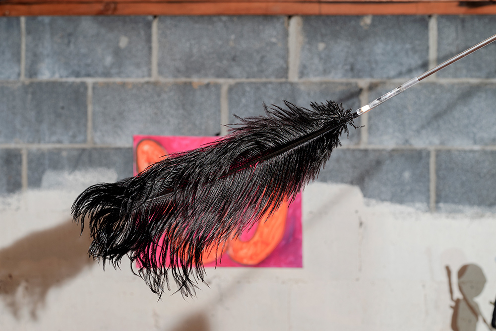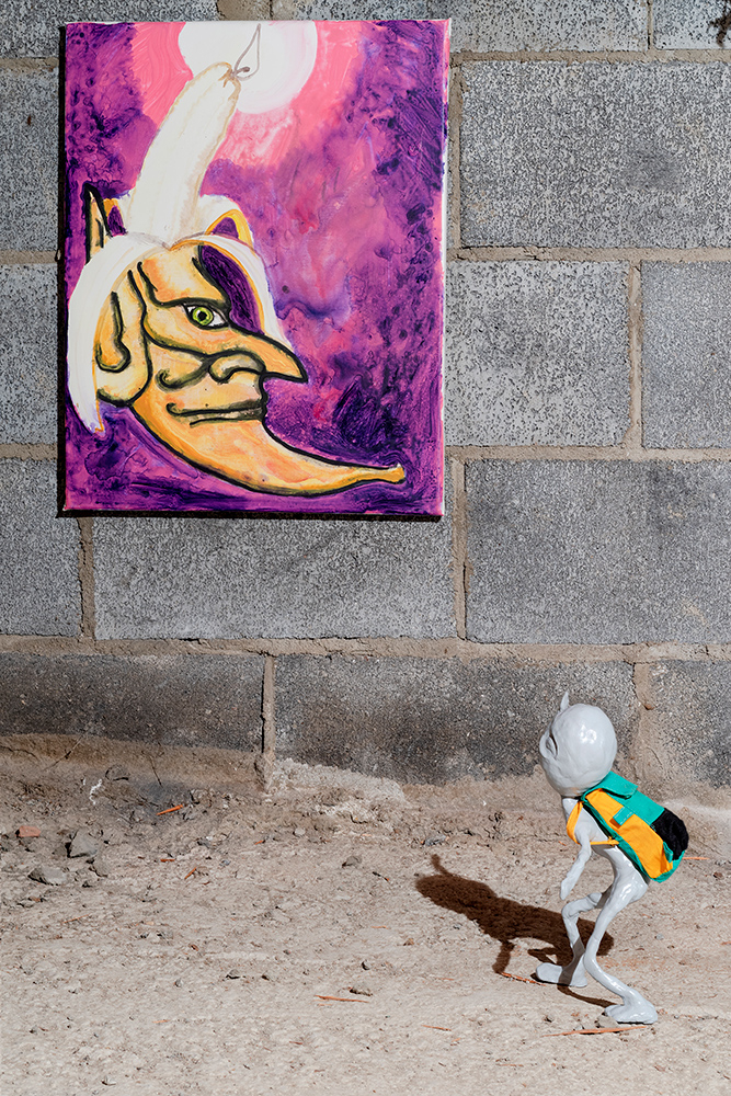 The show situates paintings and sculptural works in a loaded site for artist and project space founder Hinge: darkZone is located in the basement crawl space of his New Jersey family home. Along the walls Hinge’s colourful figurative paintings bring to mind schlocky trash films and pulp pop culture, while the cellar is populated with the distressed figurine sculptures of Sargent, along with Sullivan’s kitsch ceiling fan installation. The works in kissed by profane grace play to the space’s feeling as a site for childhood retreat into skewed imagination.**