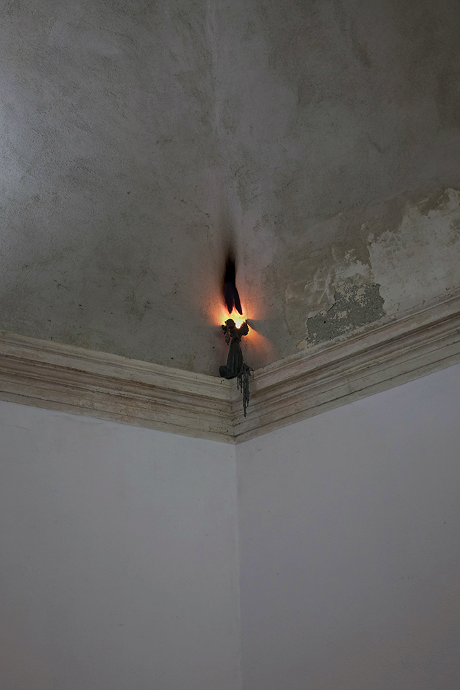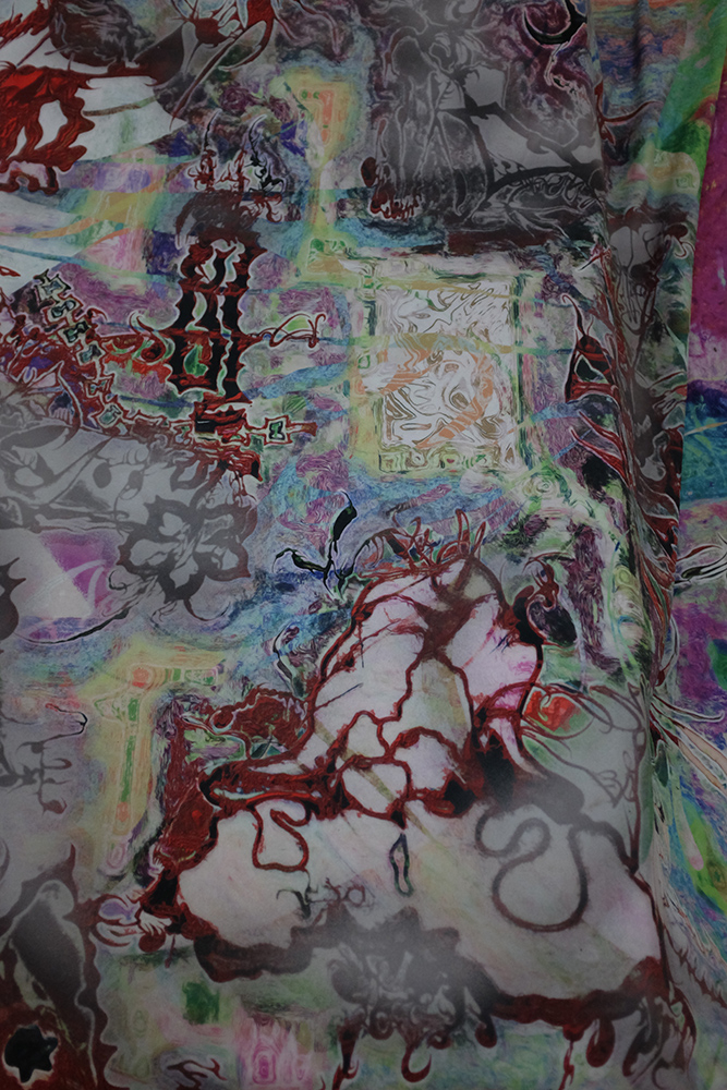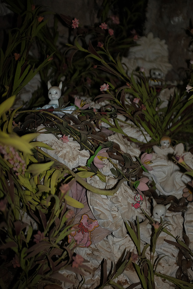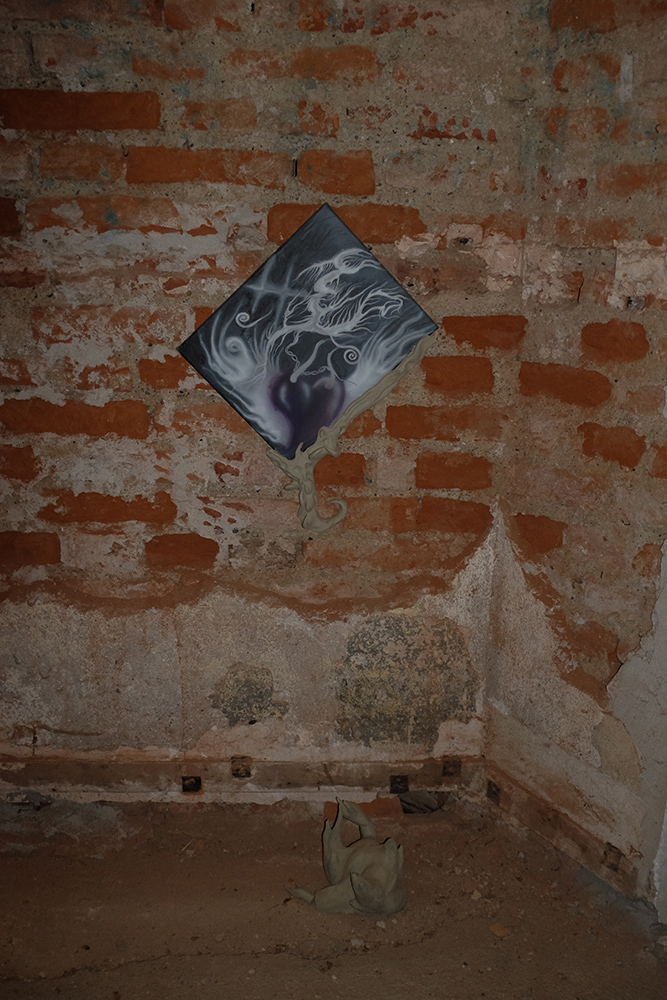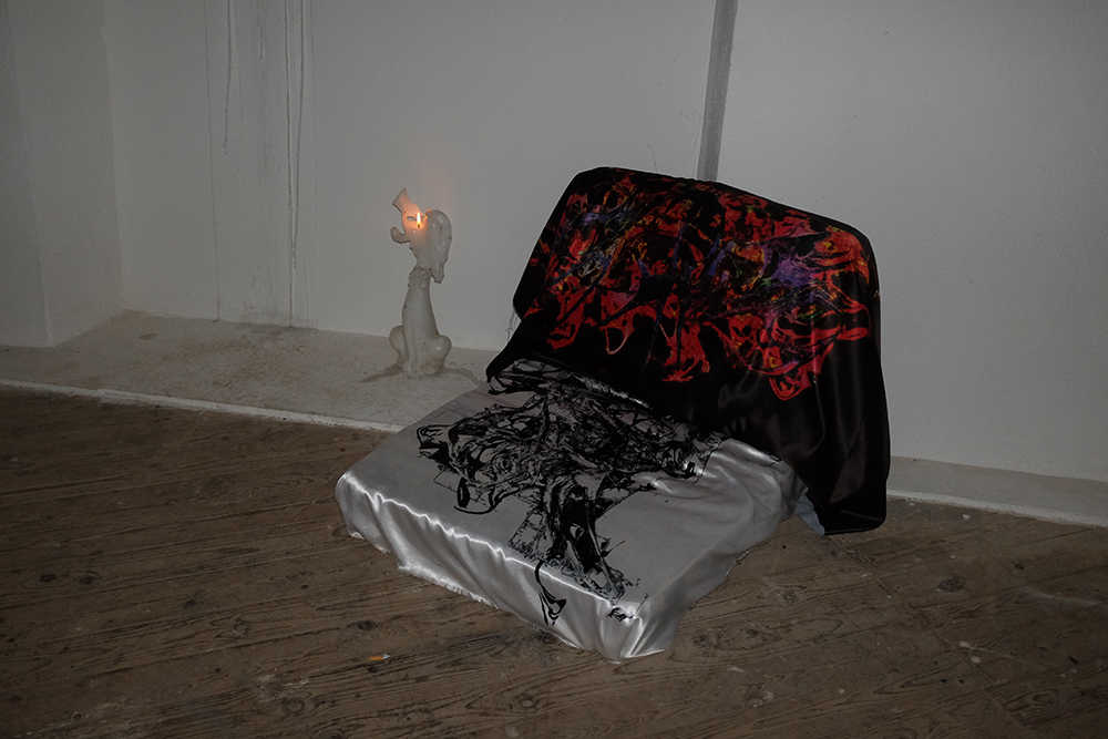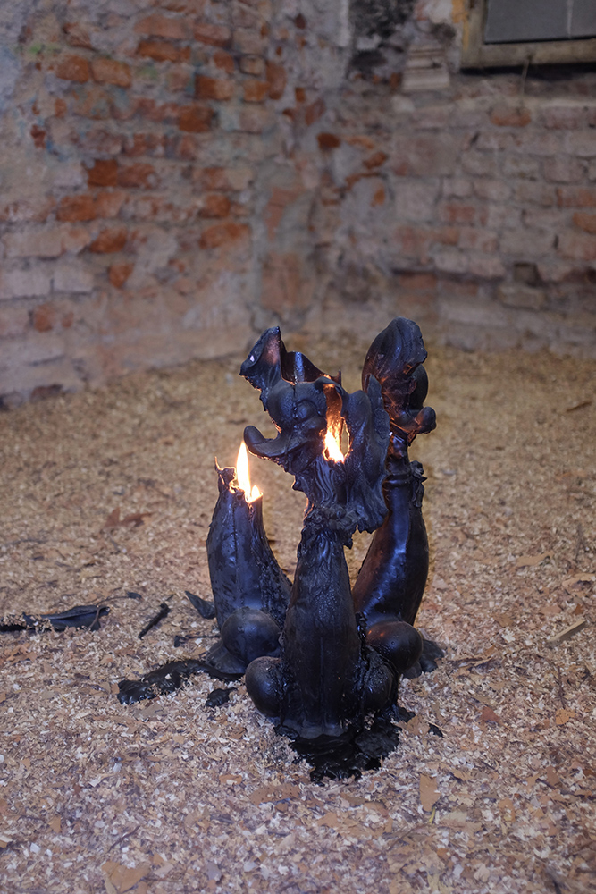 Installed in the dimly candlelit site, the show included work by the aforementioned curators, as well as Hélène Padoux and Trikkboi, with performances by Kareem Lofty, Heith and OOBE on opening night. It featured installation and wall works set against the castle’s aged and eroding walls, making a dense gothic atmosphere for sublime anthropocene reflections. The exhibition’s mood is echoed in an accompanying text produced by mrzb, that can be heard read by Ivan Cheng in a track by Qualiatik, available to stream above.**