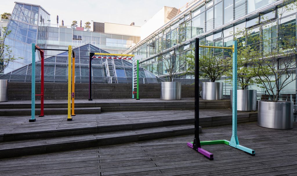 Kosmas’ art here collides with the Routine à la mode group exhibition. Try as one might, there’s never a concrete end with exercise. Even the most perfect body, or the strongest muscles, atrophy if left alone. Without upkeep, without routine it all comes crumbling down. Consider Kosmas’ contributions to the 9th Berlin Biennale in 2016: ‘Power Rack, ‘Rig’, and ‘Squat Rack’. Their simple names perform all necessary description, acting as indexes of what they claim to be, namely, brightly-colored versions of the steel, modular exercise equipment used by weightlifters. Just like their namesakes, they are intended to be used, and every Saturday during the biennial, Kosmas and other trainers held regular, guided workout sessions for the public. The key here is the insistence that the artist’s contributions are not a statement, installation, or performance but instead ‘simple structures’. Their being aligns with action, and they are exactly what they do: creating structure through durational practice, pulling together the physical and the social fields into a particular form, with all its attendant meaning—but only for as long as they last.