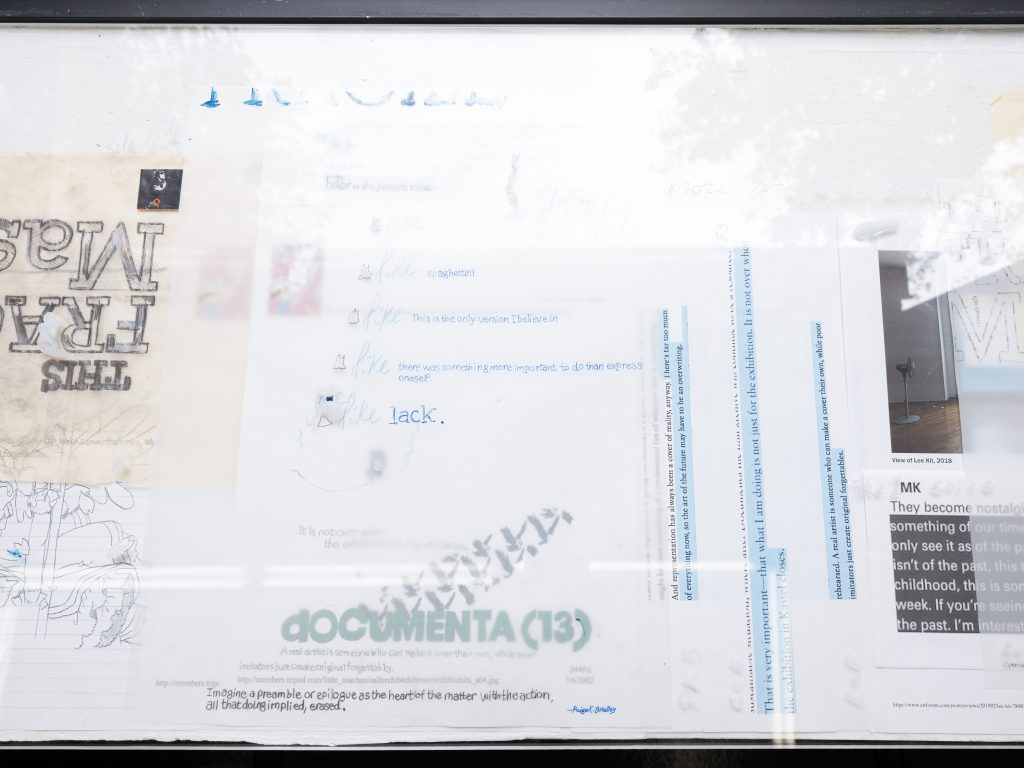 Paige K.B. enacts the theme most successfully with her 2019 site-specific collage ‘imagine this publication from exceedingly minor riffs Toward a Theory of giveth and taketh away w/breaks for Paige K. Bradley’s correspondence in a stream of promise’. It’s difficult to describe exactly what this piece is or does, with its 24 listed materials, but that might be exactly the point. Small drawings of birds sit next to hand-written notes, all layered on top of printed texts ranging from reviews in Artforum written by the artist, to an old interview with Mike Kelley. A moodboard of marginalia without a body to orbit, it’s a site of endless conspiratorial connection that inspires the ceaseless appetite of the paranoid mind, where logic runs amok, endlessly associating and attempting to discern the link between spaghettini and Gertrude Stein. Try as they might, however, the six works, one by each participating artist, only tenuously achieve true motion, and ultimately they rest—as objects placed within white walls tend to do—with a rarefied air that discourages action and cautions against movement, lest they be disturbed.