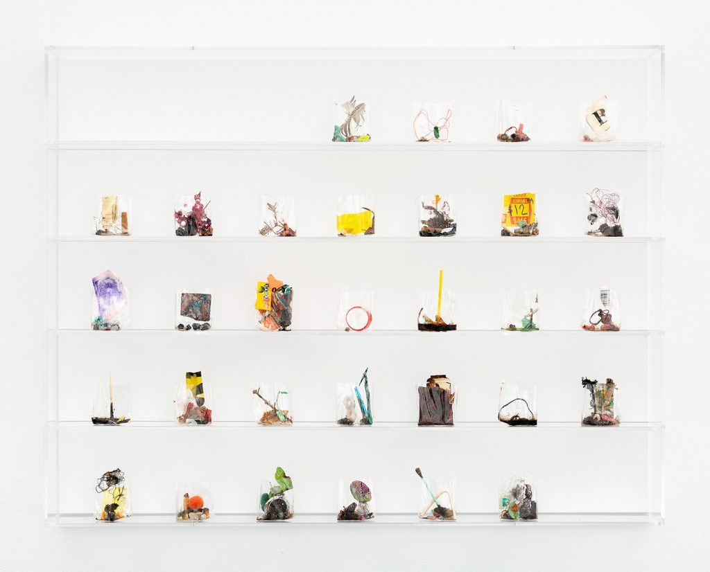 Biennials, however, are only temporary, and after three months these simple constructions, were dismantled, undoing the world they had formed around them. Looking for a longer timeframe leads to the work of Yuji Agematsu, who has taken daily walks through the New York for the past 40 years since moving to the city. The artist’s wanderings eventually developed into a more concretely productive practice, where he would gather miniscule bits of garbage found during the stroll and arrange them in daily collections. At first they were contained in Ziploc bags but later in what he terms zips, the cellophane packaging from the cigarettes he habitually smokes daily.