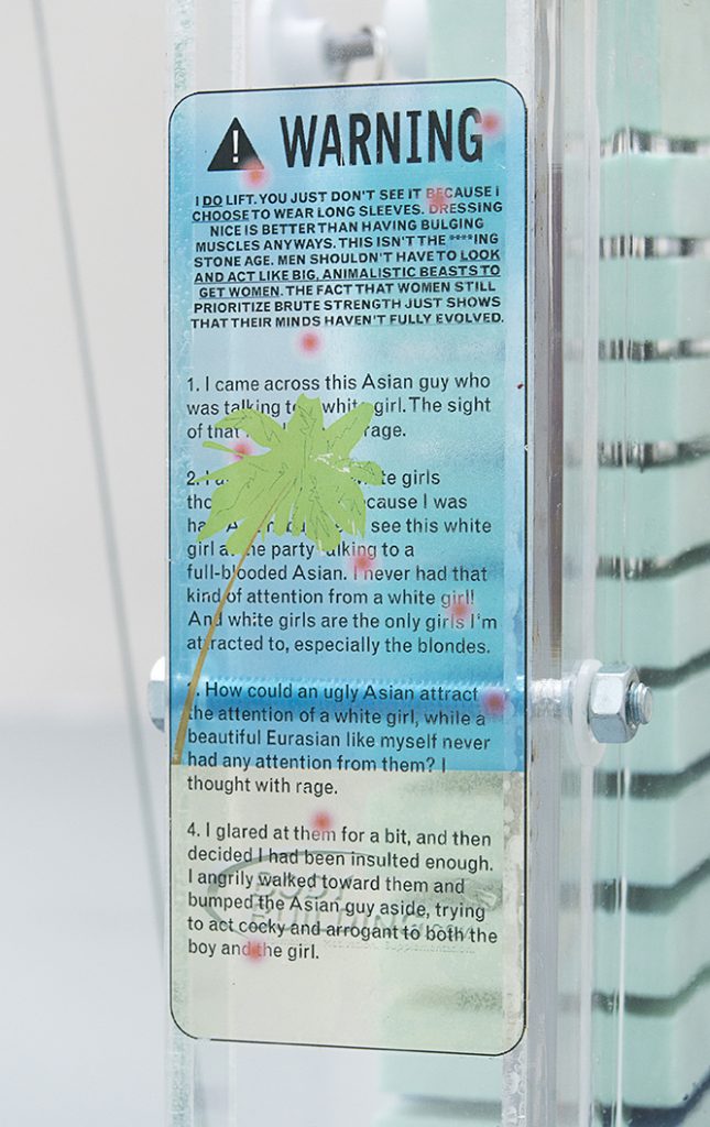 VM: The source text for that piece is the manifesto of the Isla Vista shooter. I was a freshman at UCSB when that happened. To me, he’s fragile and refuses to admit power. I was excited by the diagrams on the cable [weight training] machine in that piece, and to figure out what to do with those. I was thinking about how the sentiments in the manifesto were similar to those first expressed on the early alt-right spaces of bodybuilding and pick up artistry forums. Trisha and I were already making a gym machine, so we were thinking about fitness, and the eugenicist logic that’s espoused by the wellness and fitness industry. I selected passages where there was an invocation of racialized self-hatred. So diagrams became a way to bridge the diffuse white supremacy of the fitness industry with the concrete fascism of the shooter’s manifesto.
