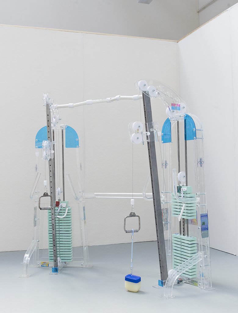 Masharani’s 2017 show It Might Be Warm But It’s Not Clean with Trisha Cheeney at Philadelphia’s High Tide examined masculinist fragility, drawing from a widely circulated shooter’s manifesto. Their collaborative piece, ‘FEELME’ reminds us of the violence that arises out of the confluence of fragility and powerthe manifesto’s author, imagining himself as utterly disenfranchised, weaponized his self-hatred in a rampage in Isla Vista in 2014. ‘FEELME’ consisted an acetate, insulation foam and CNC-milled weight lifting machine, mounted with dogmatic texts and diagrams. Along its sides, a chart for bodily maintenance instructs users to “Inspect: Groin, Biceps; Amazon Cart; Gun Legislature, Affect Industry.” These regimens cohere in the form of a legible Bro: one who embodies toxic masculinity through his participation in fitness culture and entitlement to sex. ‘FEELME’ investigates disempowerment (in this case self-constructed), as this figure reenacts the conditions of his victimhood in endless, looping psychodramas.