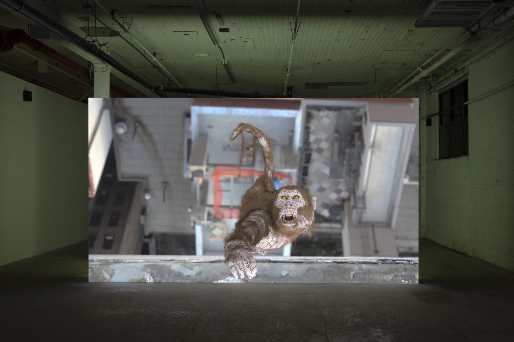 **You use the loop musically, but also to prolong bodily gestures that are unsustainable. I’m thinking about the video game character, Ness, who you show stuck on the edge of a platform wall about to fall forever. Or the chimpanzee in ‘You Can’t Turn Me Away’ that’s always about to drown but is forever in the moment just before.