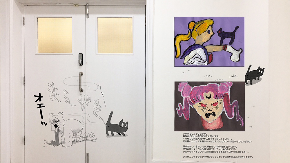 Featuring work by Justine Aubrite, Jim Feng, Ala Flora, Simon Hanselmann, Lawrence ‘Raw Dog’ Hubbard, Kiki Jiao, Castell Lanko, and Charlotte-Maëva Perret, the show took its premise of market-driven brand power through the phenomena of the knock-offs and fakes populating commercial stands. As the press text notes: “bootlegging suggests a poetic disregard for the norms of status-enforcing systems, negotiating class differences by adapting media and materials in inventive ways that resist the use value of the original, and using capital to do things it wasn’t designed to do.” Other contributing artists include Lydia Mathis, Alex Rathbone, Sheiko Reito, Jaqueline Ruther aka Mizucat, Dave Sayre, Ruini Shi, Jack Stevenson, Ray Tat, Twee Whistler, Jyn Wye and Youada.**