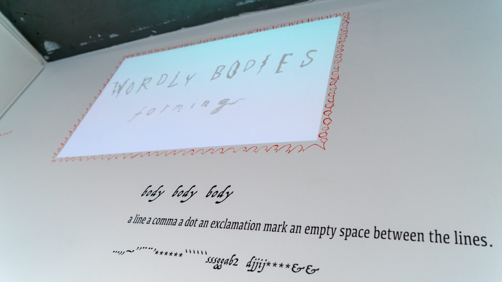 It’s in light of ‘toxinosexofuturecummings’ that the TWAH (=These Worlds Are Here) exhibition opening in Highland Park a couple weeks earlier gains newly eroticised meaning. Parked on the road outside Hikawa and Zizia studios, the rear doors of the Gas Gallery panel truck are swung open to reveal a gaping white space with blushing red text snaking its inner walls. They read in sentence fragments, like, “letters for a parallel reality to which the writing body extends”. There’s a mutating projection of the accompanying Worldly Bodies zine title in the centre, supported by a murmuring soundtrack of contributors reading their work, developed during a workshop at Navel in early July. “I love your face. Look at you,” reads Ala-Ruona’s disembodied voice, winding around and through the other spoken word pieces circling themes of the erotics of technology and somatic fiction. “Teeth, in the flesh, biting and penetrating, gently and firmly. A game without winner. My heart is a beast.”