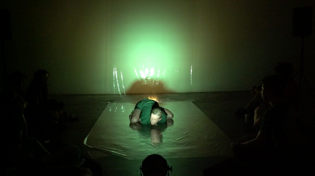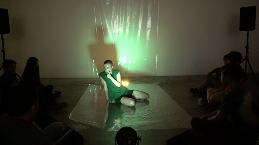 Visiting California in July for a series of events and an exhibition organised by mobile gallery Gas across venues, Ala-Ruona presented ‘toxinosexofuturecummings’. The performance is a provocative bodyfiction speculating on the role of queer ecologies within contemporary gender and anti-toxicity discourse. Covered in oil, the artist slips, slides and squirms on a swath of clear plastic, sucking, smacking and masticating into a handsfree microphone as their audience takes a seat in the darkened space of Chinatown’s Human Resources. Glowing alien green, the artist’s gaze is unwavering as it moves defiantly across spectators. Pale irises and dilated pupils trace the room, returning its occupants’ gaze and confronting their own voyeurism, as Ala-Ruona recites, “You’re fucking me in the ass with a sparkling, slivering, glittering, translucent, perfectly plastic dildo that’s wrapped around itself”. Satu Kankkonen’s sound design generates an ambient undertow of watery, squelching pads that unsteadily support the text’s themes that are equal parts academic and pornographic. Ala-Ruona’s parafictional protagonist ruminates on a childhood obsession with car exhausts and sexually explicit accounts of anonymous ex-lovers crossing biology, ecology and popular culture. “You pull me to your hard, plastic embrace and carry me to the back of your car. You push my face against your car tailpipe.”