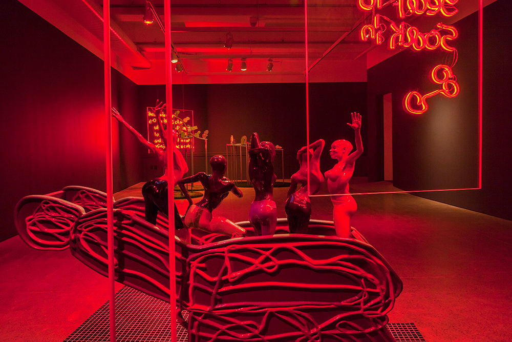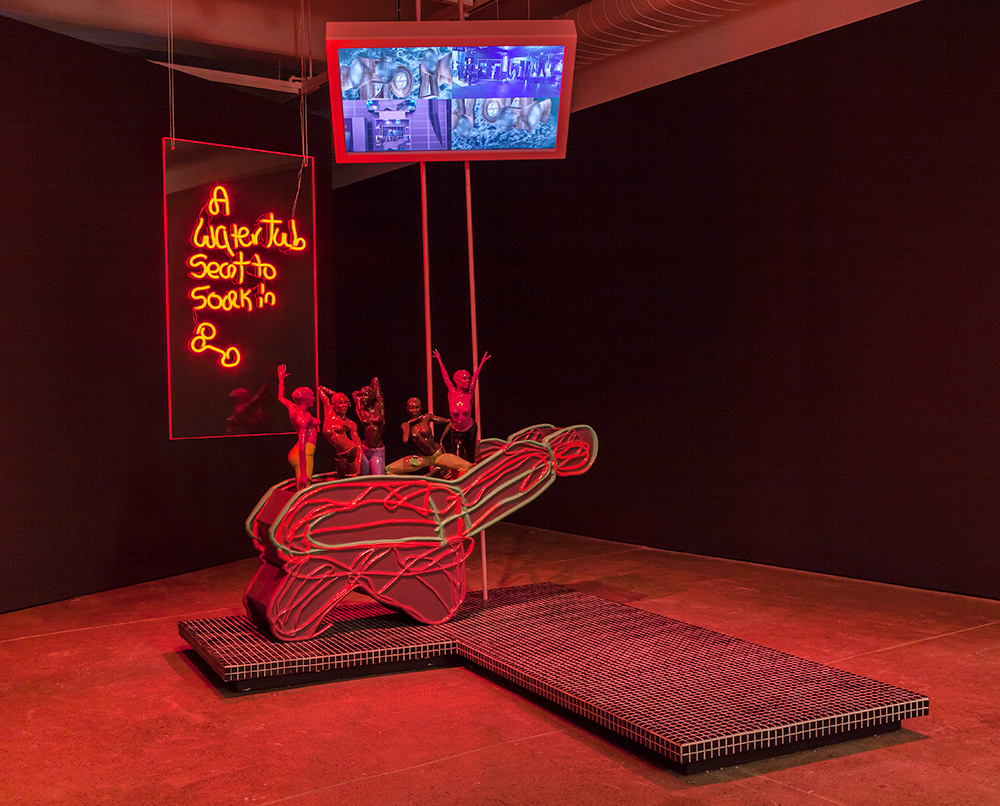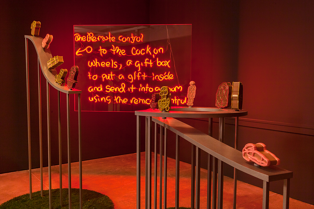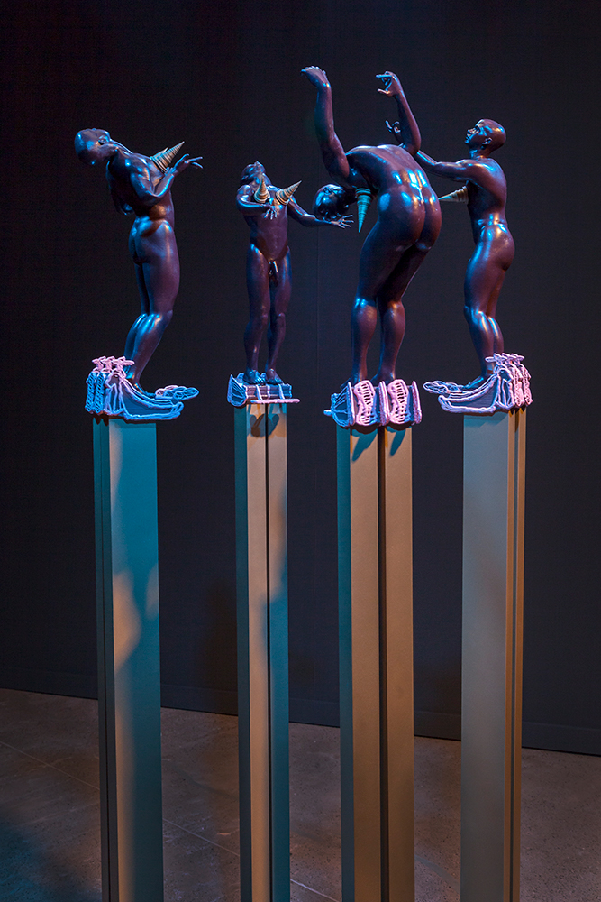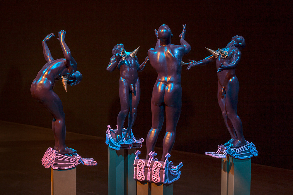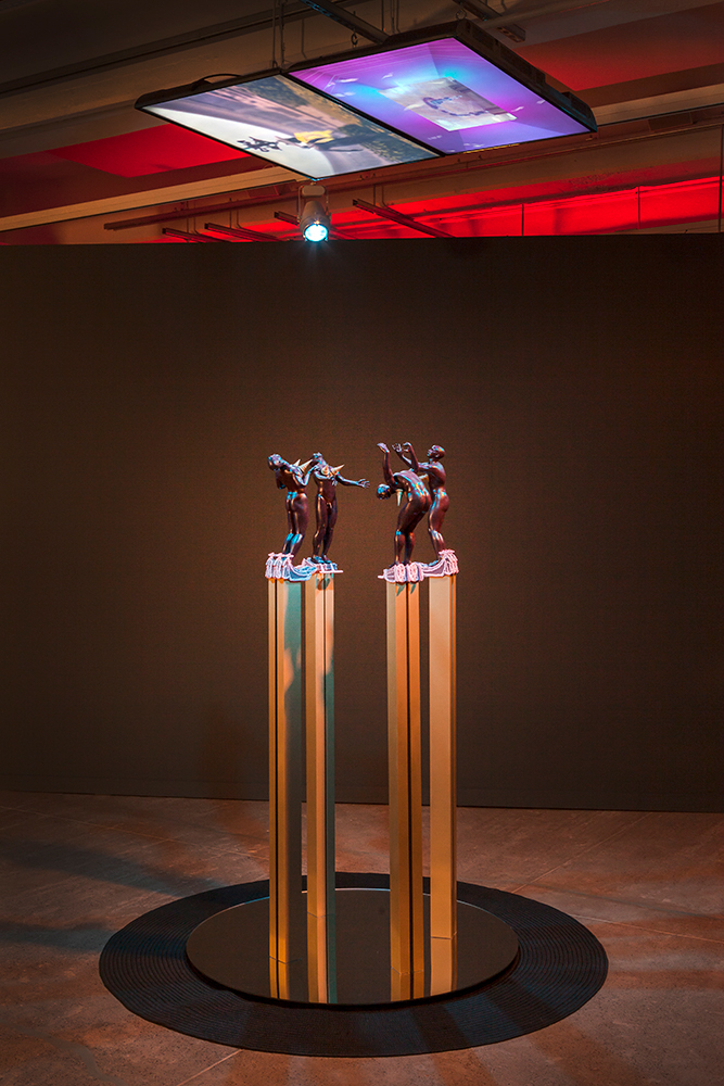 Realised during an artist residency at the museum, imagery from Satterwhite’s digital animation practice was materialised using digital fabrication such as 3D printing, creating an immersive landscape from Satterwhite’s mix of pop culture, dance, queer futurism, and personal family history. As stated by the press release, in the artist’s work “neither time, space, scale, nor societal normativity limit the expression of his characters or architecture.”**