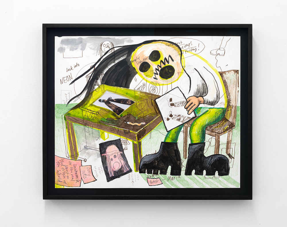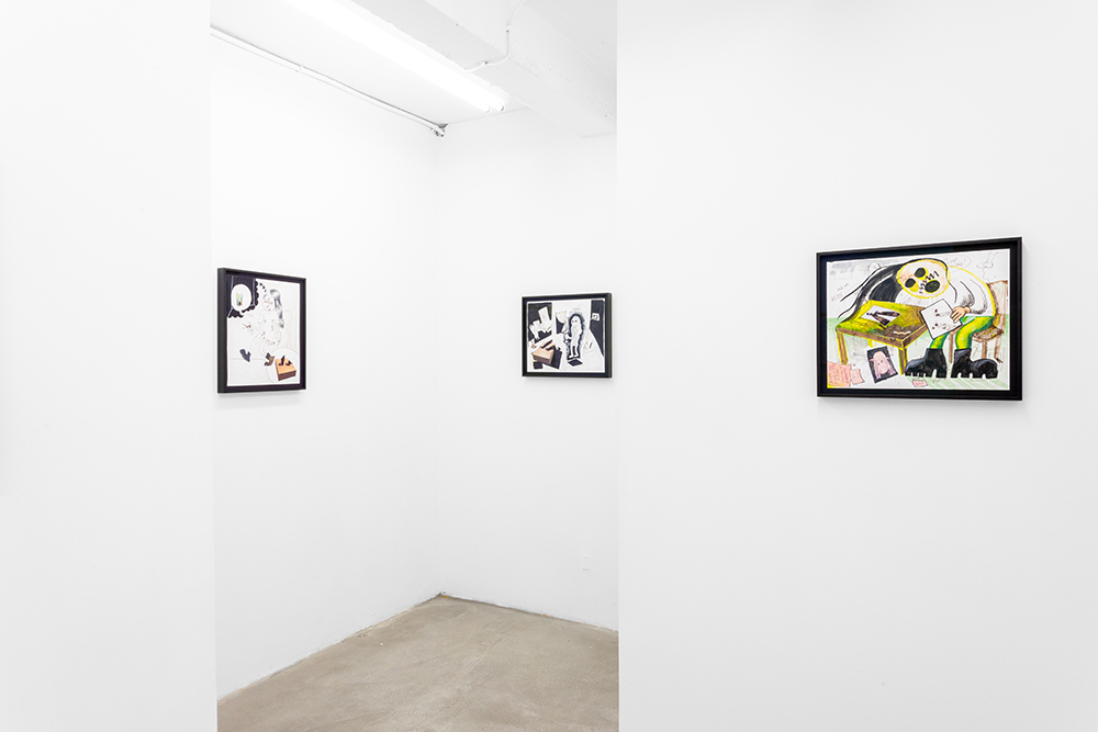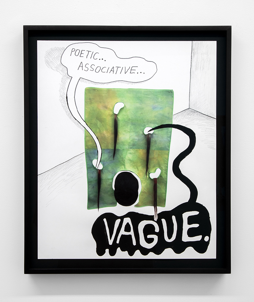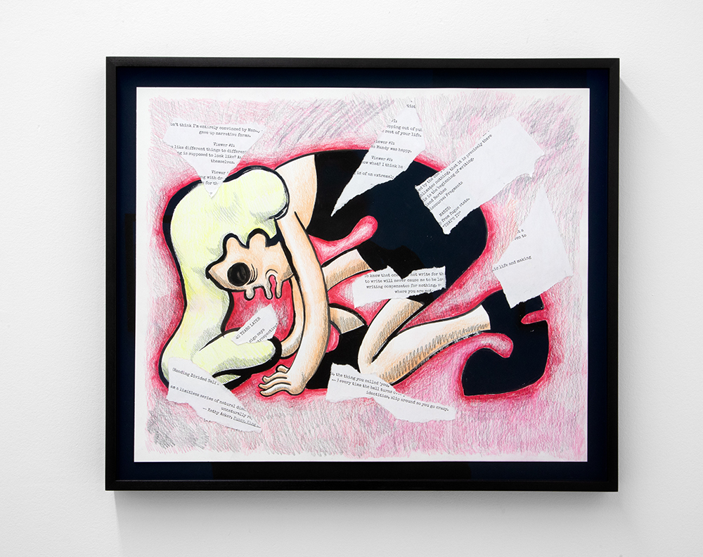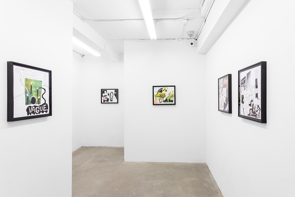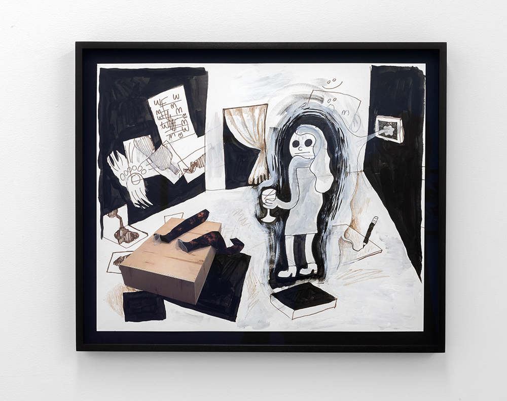 With illustrated works on paper, the artist — known for his Wendy comic series of a young woman navigating art world anxiety — draws semi-autobiographical musings of social neuroses. As noted in the press text, Scott’s “images combine snippets of lived experiences, and slip between reality and fiction.”**