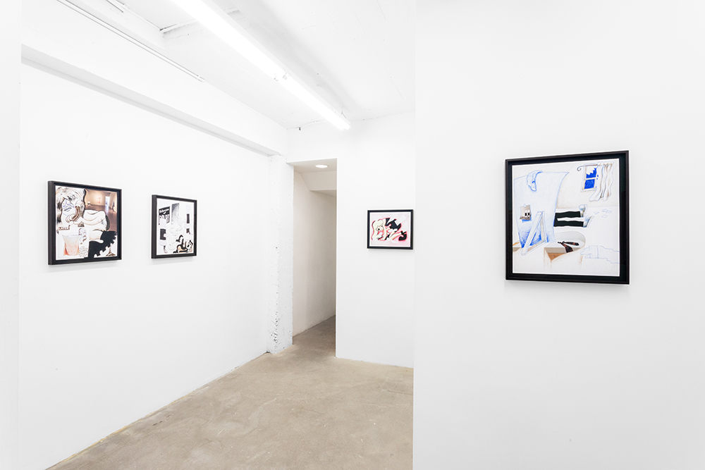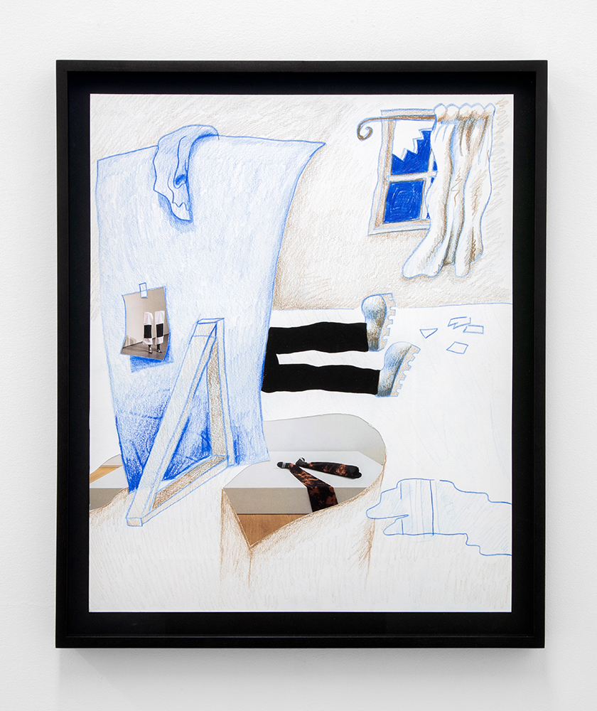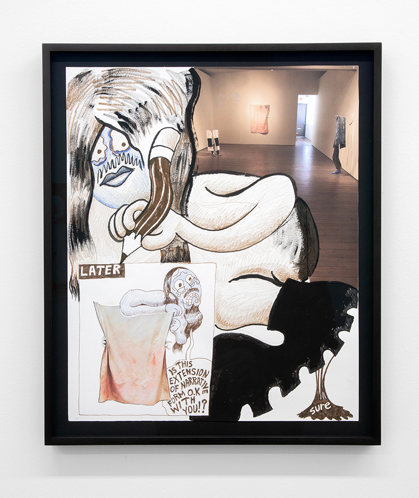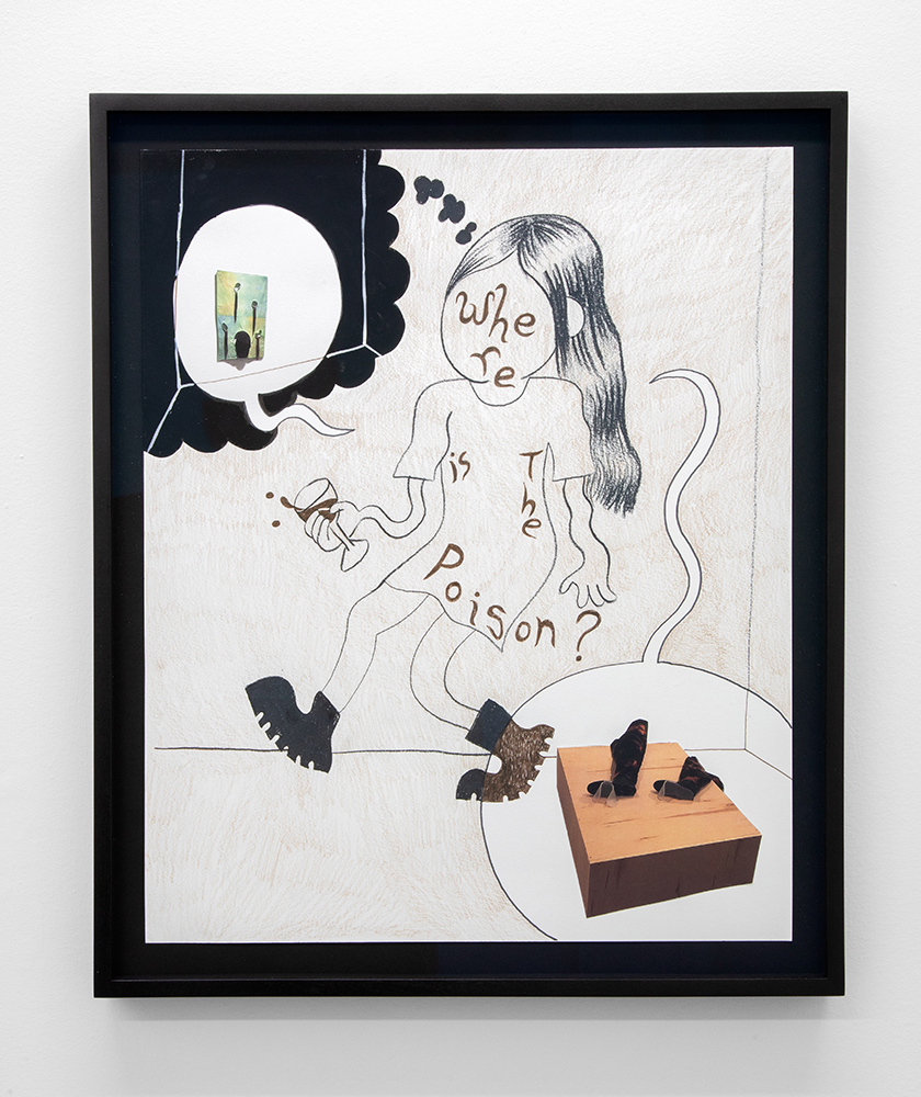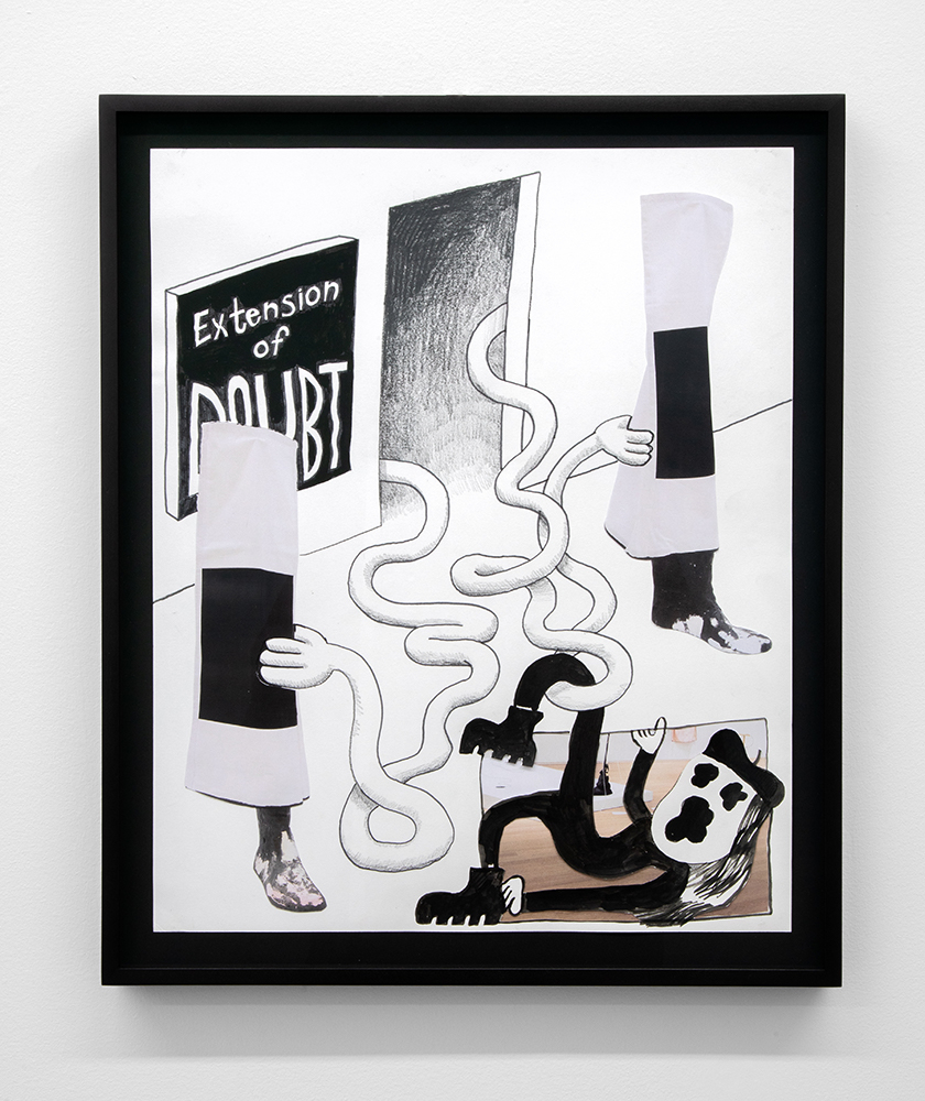 With illustrated works on paper, the artist — known for his Wendy comic series of a young woman navigating art world anxiety — draws semi-autobiographical musings of social neuroses. As noted in the press text, Scott’s “images combine snippets of lived experiences, and slip between reality and fiction.”**