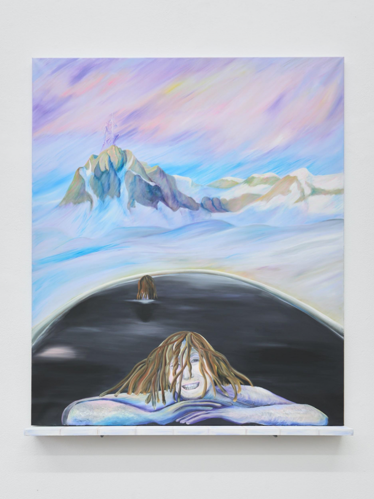 Marchi’s interest in a ‘girl power’ momentum that mythologized a generation’s outlook onto the perimeters of life clearly shapes the painted narratives that her characters inhabit. In their lazy poses, these creatures carry a teenager’s defiance, best embodied by one of the painted characters’ star-shaped cutouts that acts as tooth jewellery. This LED-powered glimpse from underneath a widening smile in ‘Ninfeeee’ serves as proof of their cheeky reluctance to be mere luminaries of the male gaze. The pretty figures, clouded in shades of blue, evoke the gum chewing, bubble bursting sass of a High School prom queen who is in on the patriarchal joke—a character ever present in teen flicks of the early ‘00s. In ‘I Love Segantini (with J-Lo)’, two of them lounge in a large disk of tinted lake water, towered over by a field of snowy mountain tops submerged in the pink fade of a disappearing sunset. A sketched female figure crowns this landscape, her mane and swift grip of a pole serving as her insignia in this world of fantastical femininity. The ruler of this empire of fairytale nixies is a depiction of Jennifer Lopez sporting the performative weapons used during her halftime show at the 2020 Super Bowl XVI just a few weeks prior. Personified as a pearly, shimmering Queen of Pop, Marchi excavates the playful discourses of teenagers unchallenged in being well read in pop culture and takes pleasure in the effervescent taste of those narratives.**