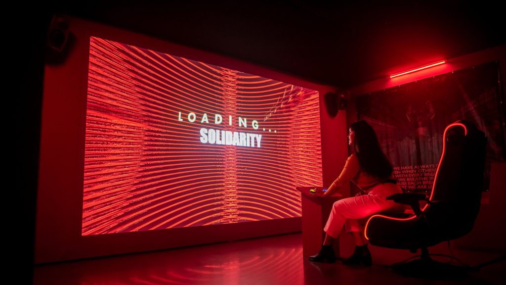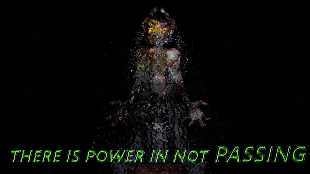 One can argue that Black trans bodies are even further degraded in this social imaginary. Constantly in a state of vulnerability, they are doubled in their othering, which is used to justify their suffering. This is re-iterated in Brathwaite-Shirley’s work ‘Digging For Black Trans Life’, in which a talk show host prompts a monstrous trans ‘object’ (a de-subjectivised other) to speak about their pain and trauma, rather than validating their experiences of love or empowerment. The artist reminds us that when we dine on Black trans trauma, we are not elevating the visibility of these communities; rather we are using them as an exotic spice to enhance the (cis) white palette. Feminist theorist bell hooks’ idea of “eating the other” comes to mind; hooks asserts that Black experiences are often commodified in order to re-inscribe white supremacy with culturally relevant narratives. Similarly, Black trans experiences are viewed as unexplored playgrounds where existing power structures are re-asserted rather than undermined. The artist’s use of gaming technology is a reminder that archives are not objective. Rather, they are often appropriated into eSports—games in which the lives of those portrayed are distorted in order to validate dominant social narratives.