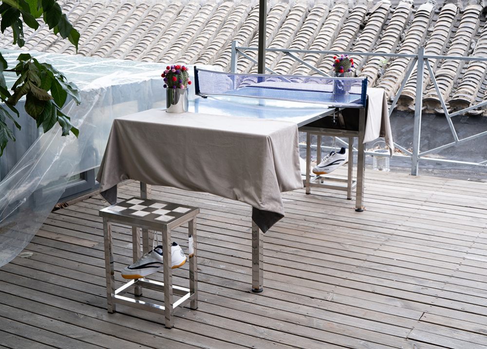 Xindi Li, Tilted And Arched (Table Setting) (2020). Installation view. Image courtesy the artist, PLATESPACE + postpost, Beijing.