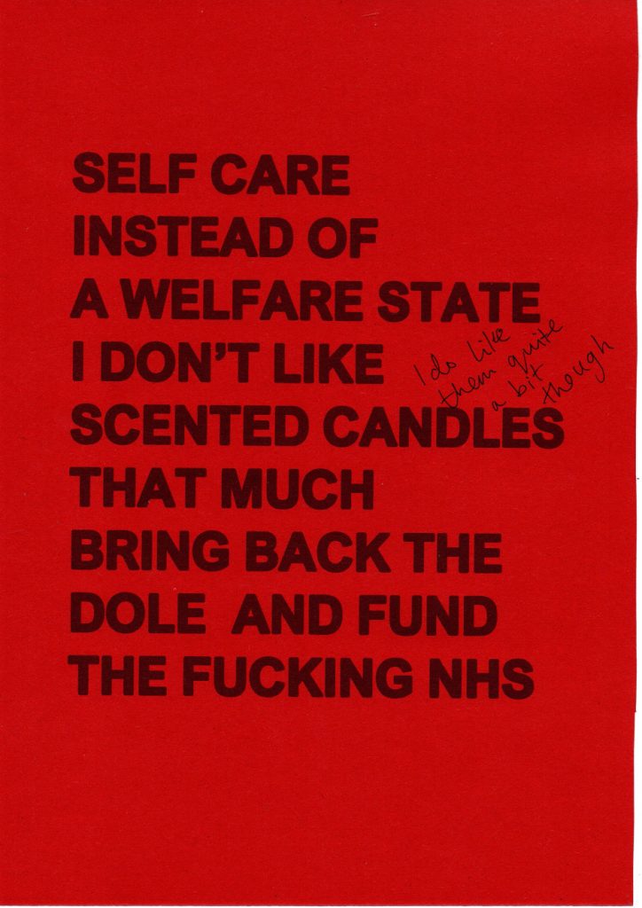 In its post-2008 economic recovery, the western world was haunted, as Fisher observed, by the ceaseless march forward of ‘capitalist realism’, or the notion that there was no better system than the flawed but better-than-nothing hegemonic global capitalist model. Into this climate came—perhaps around 2015/2016, or so—a greater awareness that things were unwell, but not unsalvageable. To deal with the stresses of an ever-growing cabal of authoritarian and neo-identitarian politics, on top of regular crises and breakdowns, a widespread movement of largely liberal, culturally-engaged, white, educated individuals began adopting the practice of ‘self-care’, propagated through the hardcore practice of Instagram posts, Snapchat and the newly-launched Instagram Stories function.
