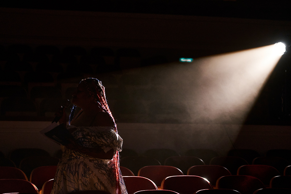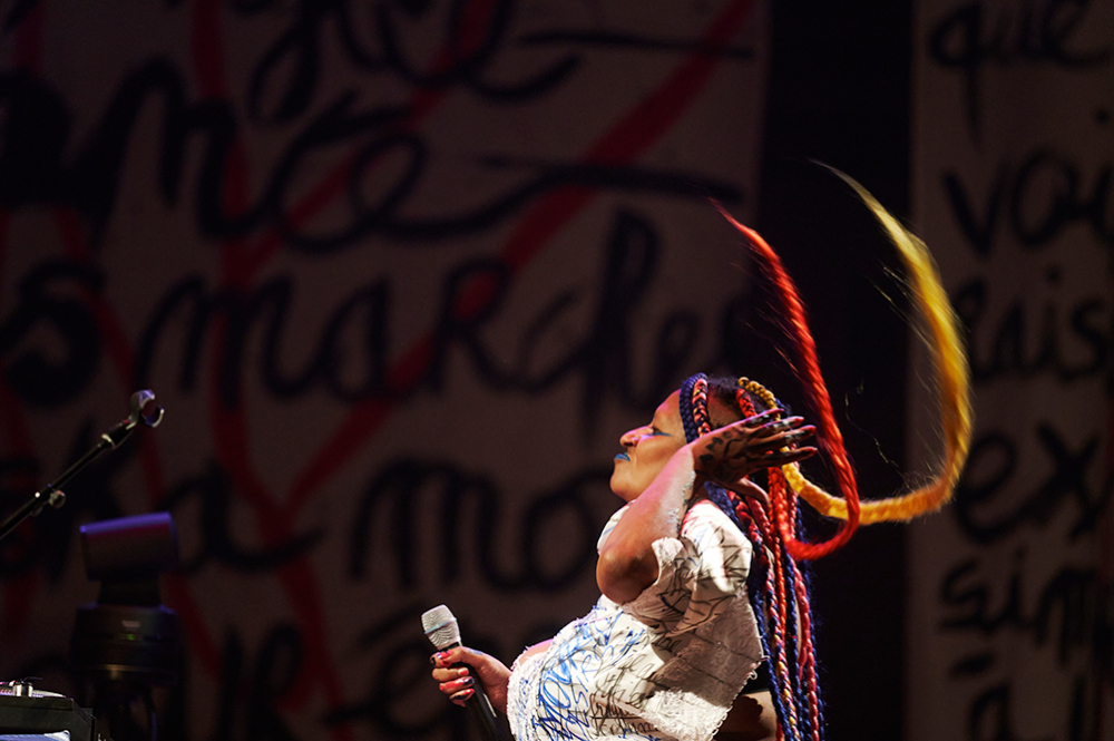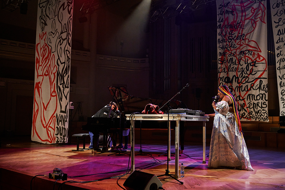 Presented to celebrate the release of artist, fashion designer and musician Vava Dudu’s first anthology of poetry, featuring text collated from Dudu’s clothing as well as lyrics from her electro-punk band La Chatte, the performance captures the artists’ multidisciplinary spirit.