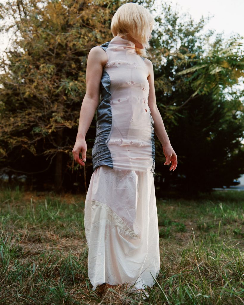 Until now Flores has modelled in her own campaigns. The process of shooting the person who has made the clothes is both an exercise in taking any specific identity out of the work and, on a more personal note, to document the time in her life when these pieces were produced. “There’s a blankness there I think is nice”, Flores explains over Zoom from an undisclosed location in Florida, where she’s been shacked up with her boyfriend for the last few months. But now, in this strange green space in Brooklyn, Flores seems to be recording something more universal: unease centred around the endless possibilities of the unknown.