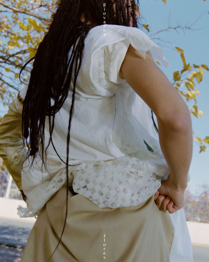 Giovanna Flores: Making the collection, I was having a constant conversation with myself about what the feeling of ‘finished’ is. I would look at this sleeve that I was so happy with but after sitting with it for a while I’d start questioning myself. I’d be like, ‘What should this go on?’ But why should I finish it? Maybe it is done and I’m forcing something on to this piece. You know, I could wear a black t-shirt and throw on this one crazy sleeve, and it makes it a thing. That’s something that I think has energy in it, which I don’t see very often.