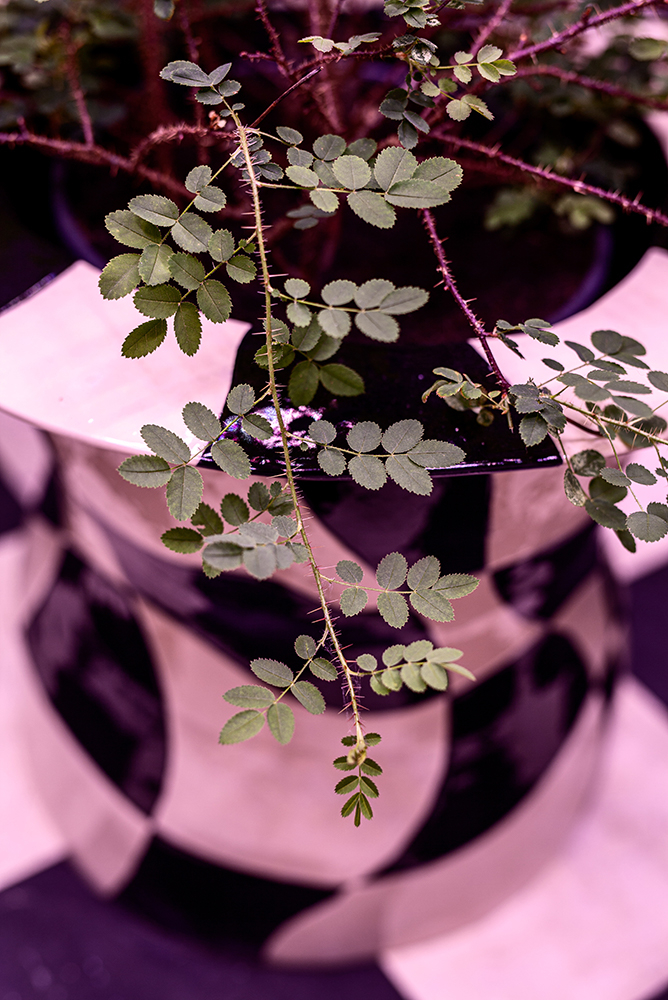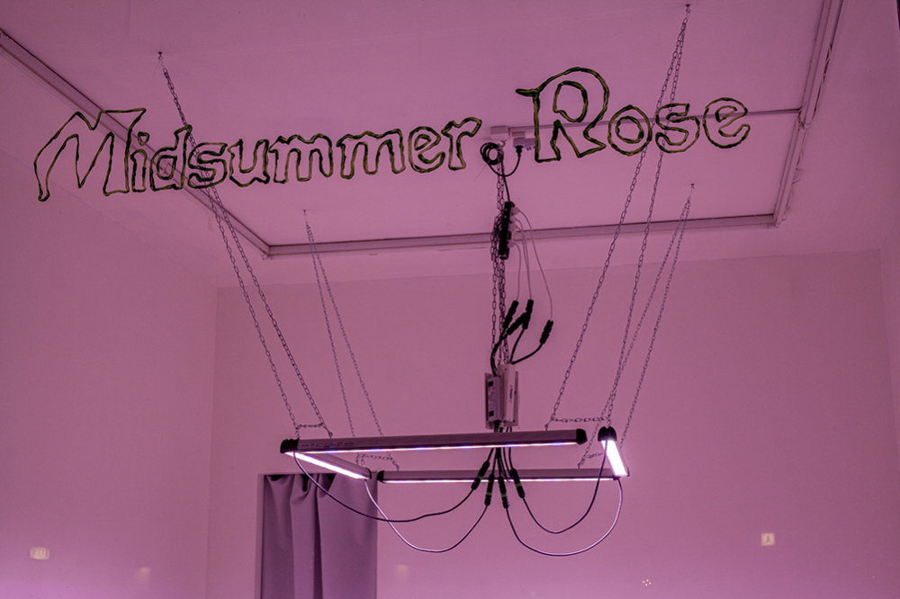 Installed in the Finnish winter, the show is built around an out-of-season native rosebush, housed in a ceramic vase by Man Yau, which flowers under artificial light as a sealed memento of a lost summer. Also featuring a zine with a contribution from Feminist Culture House, an accompanying mix by Malibu and an online LARP performance work by Susan Ploetz, Midsummer Rose evokes a kind of magical storytelling, noting that at “the end of the exhibition, when the last petal falls, the spell will be broken.”**