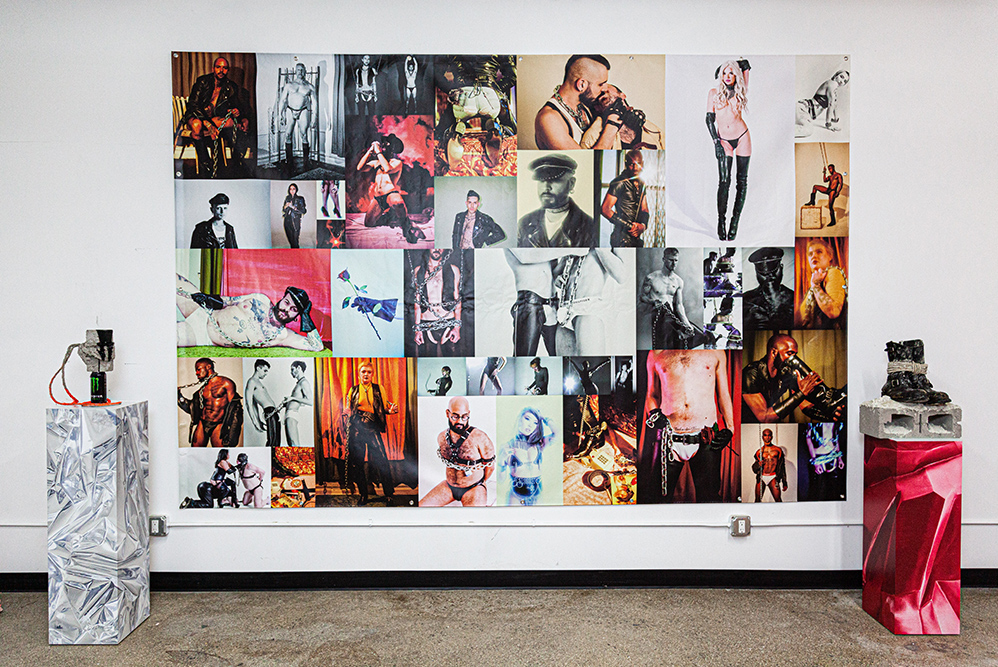 With installations of Harwick’s BDSM photography, rope, cement, gay pulp fiction and Monster Energy cans, the show materialises queer fantasy and subcultural imaginaries. The exhibition is accompanied by a run of playful merch, such as tees featuring the shitpost style slogan: “All I do is chug Monster Energy, pirate the new Linkin Park, suck dick & play Fortnite.”**