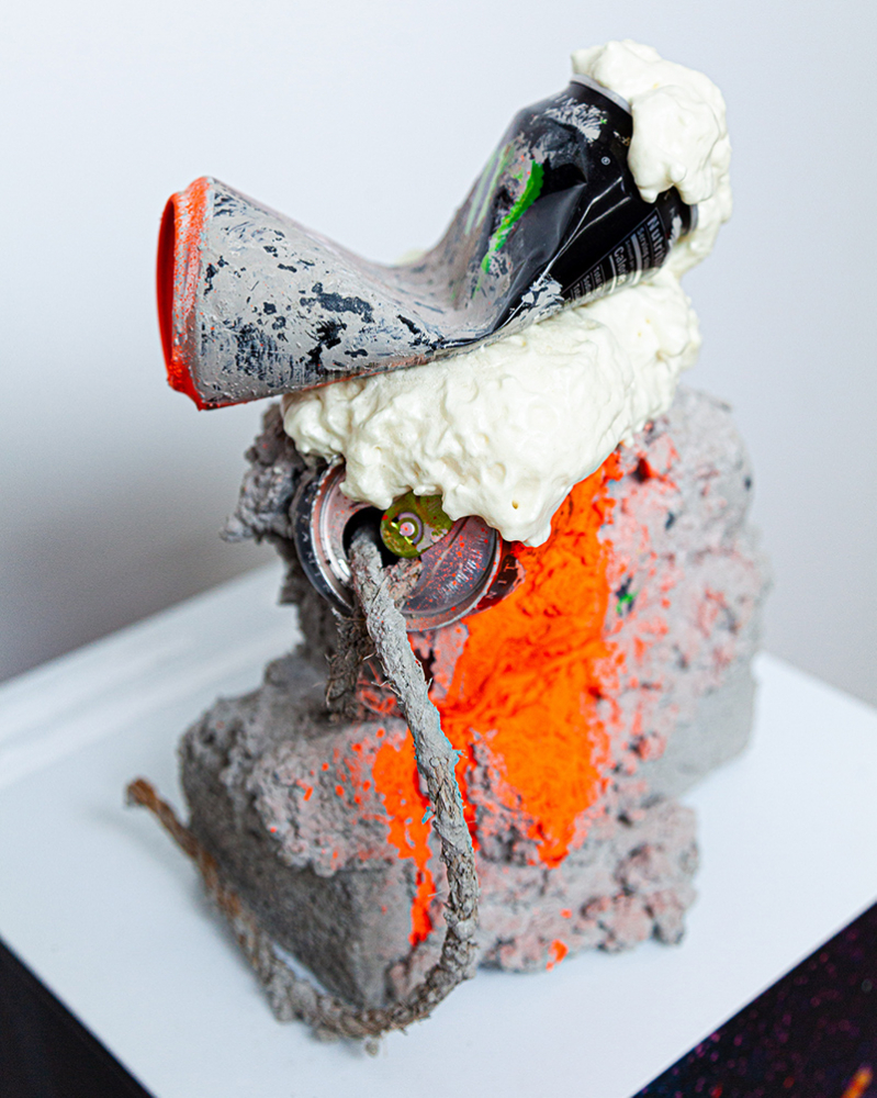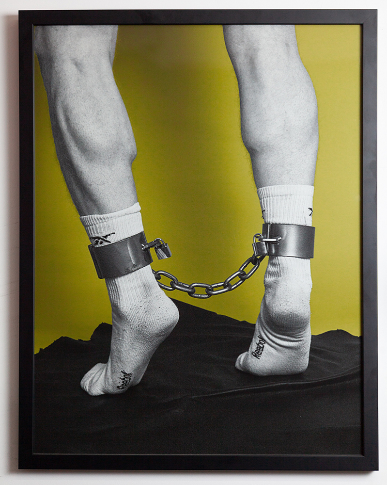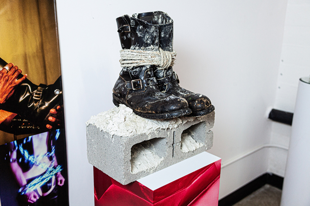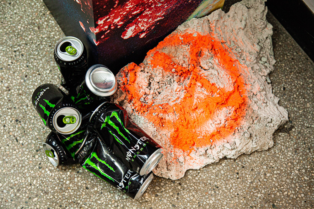 With installations of Harwick’s BDSM photography, rope, cement, gay pulp fiction and Monster Energy cans, the show materialises queer fantasy and subcultural imaginaries. The exhibition is accompanied by a run of playful merch, such as tees featuring the shitpost style slogan: “All I do is chug Monster Energy, pirate the new Linkin Park, suck dick & play Fortnite.”**