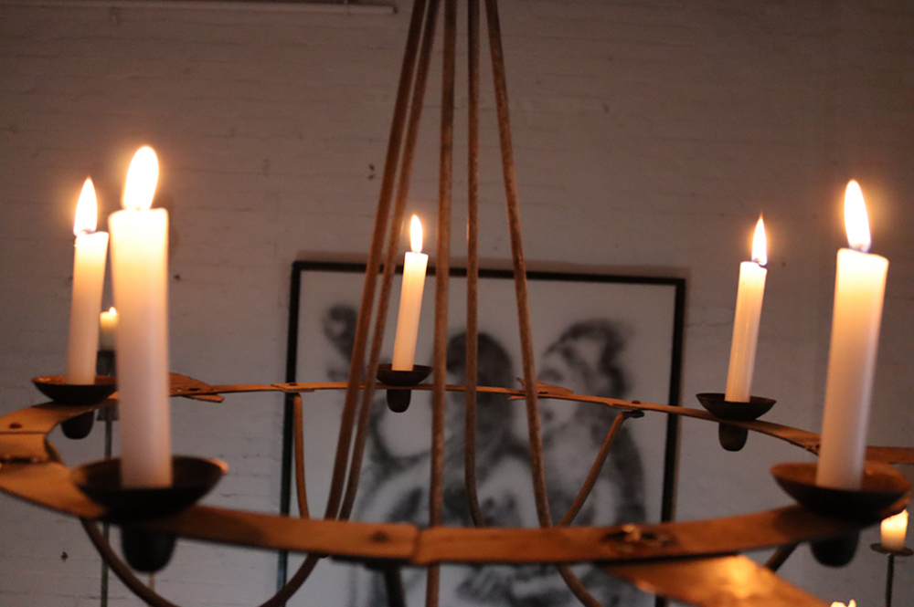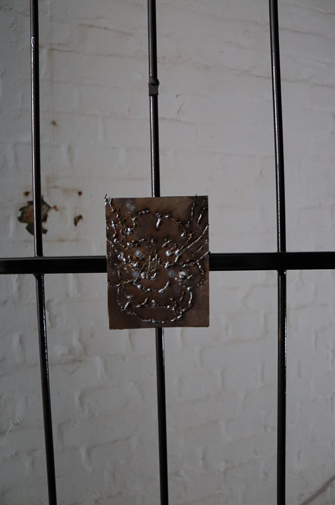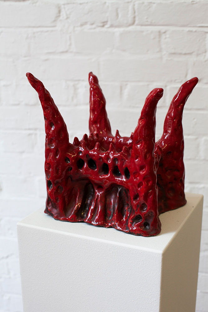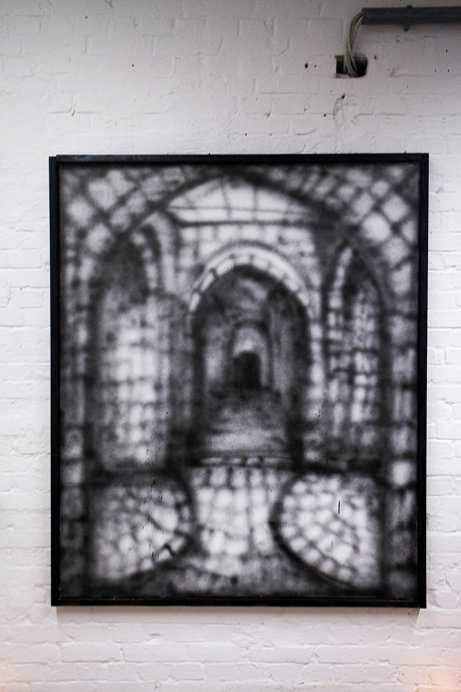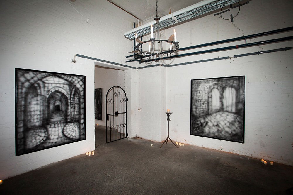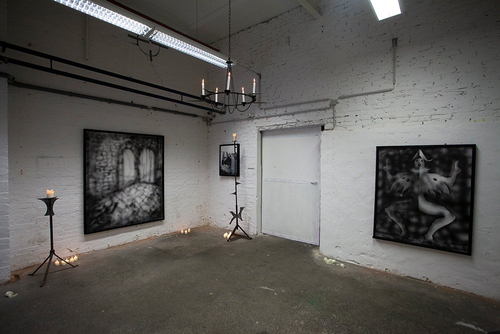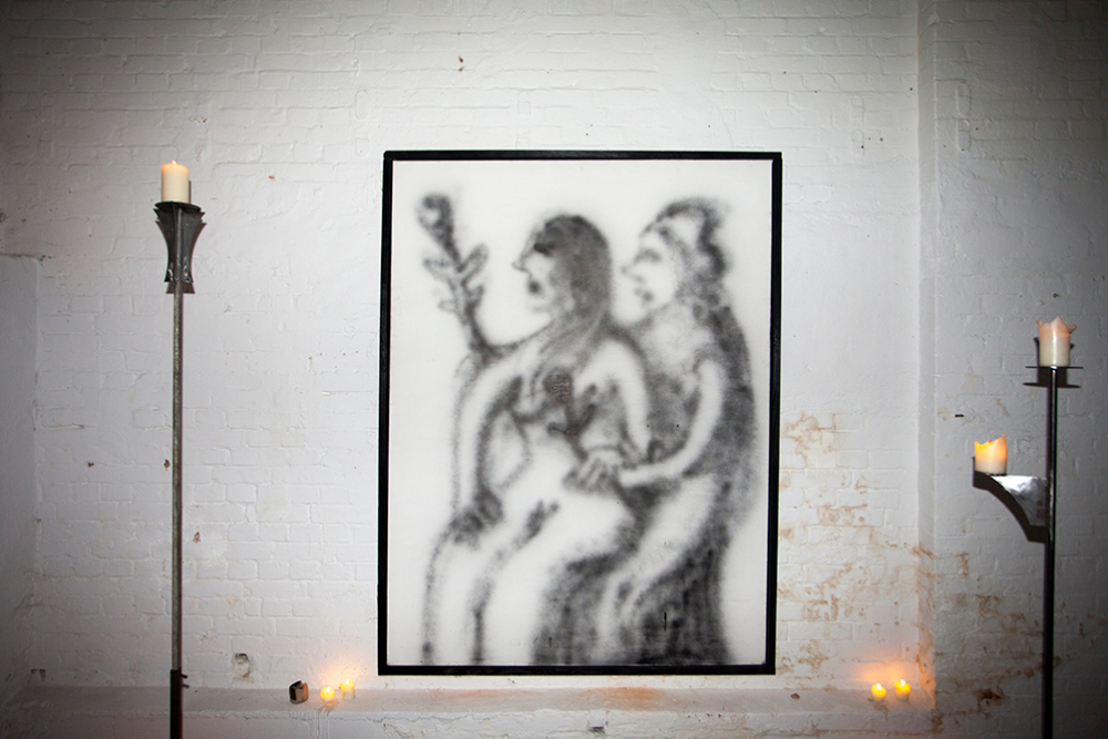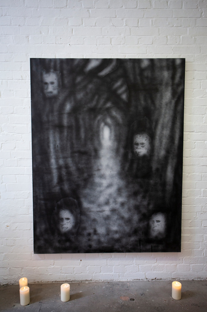 Featuring ghostly airbrushed paintings, metalwork candelabras and ceramic sculptures, Fjorsk’s work plays with the dungeon-like space to create a pop gothic atmosphere. As stated in the press text: “Playfulness underlies a steady darkness, diffusion leads to clarity on the artist’s quest for a soul in the mist.”**