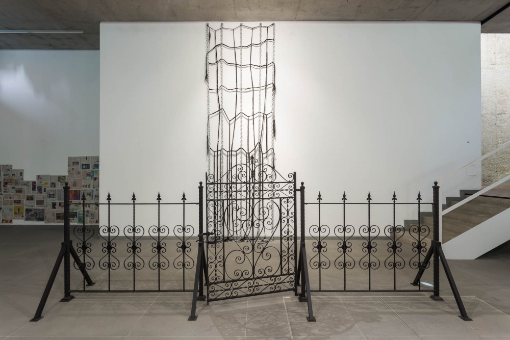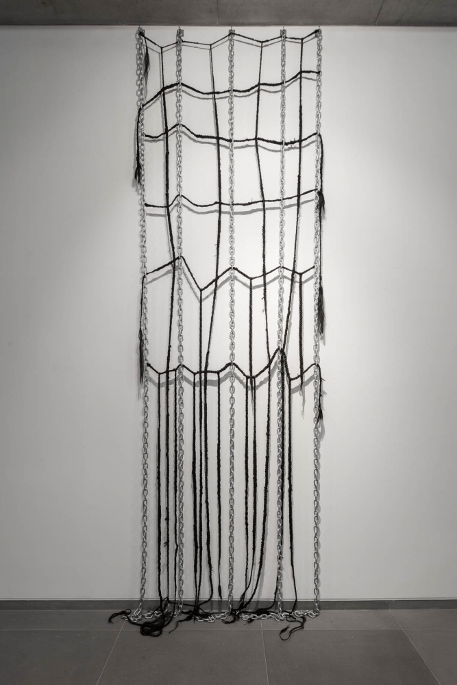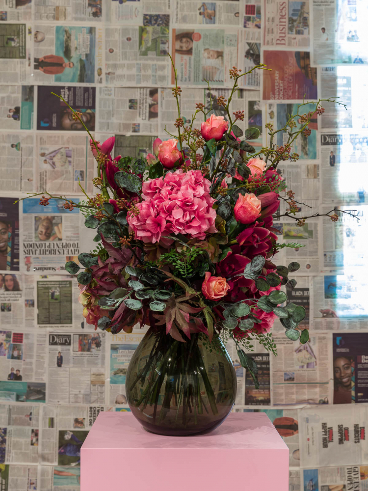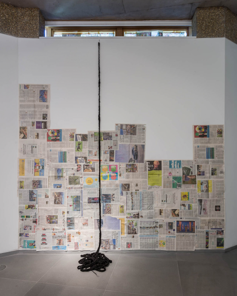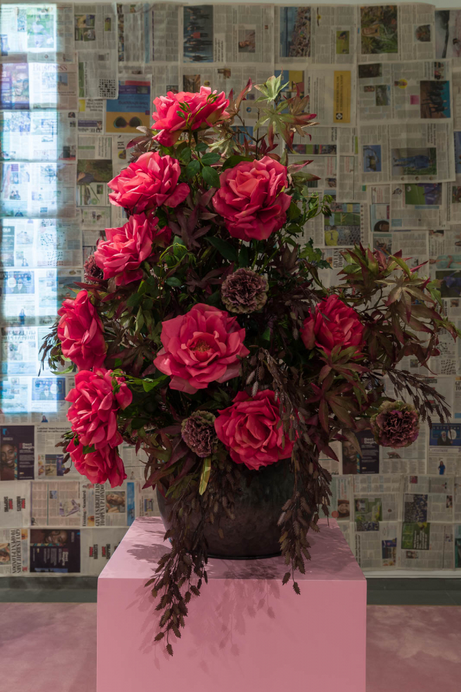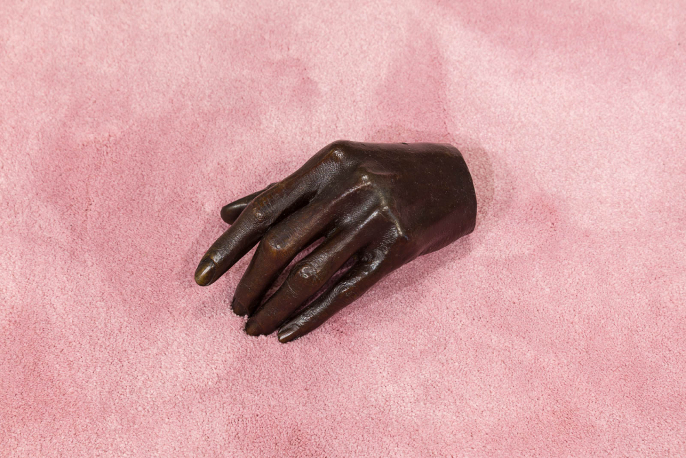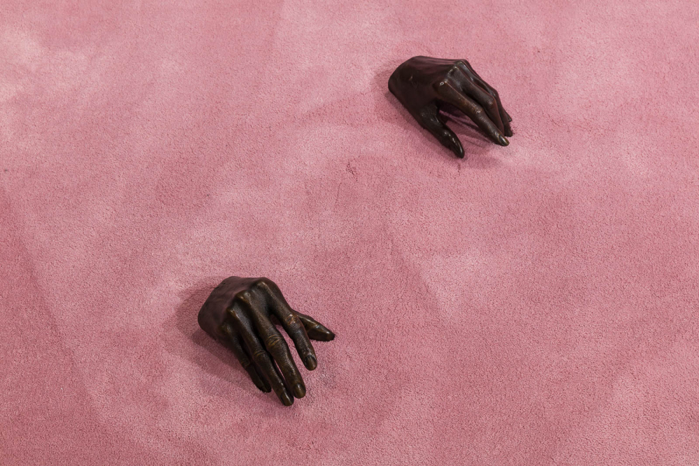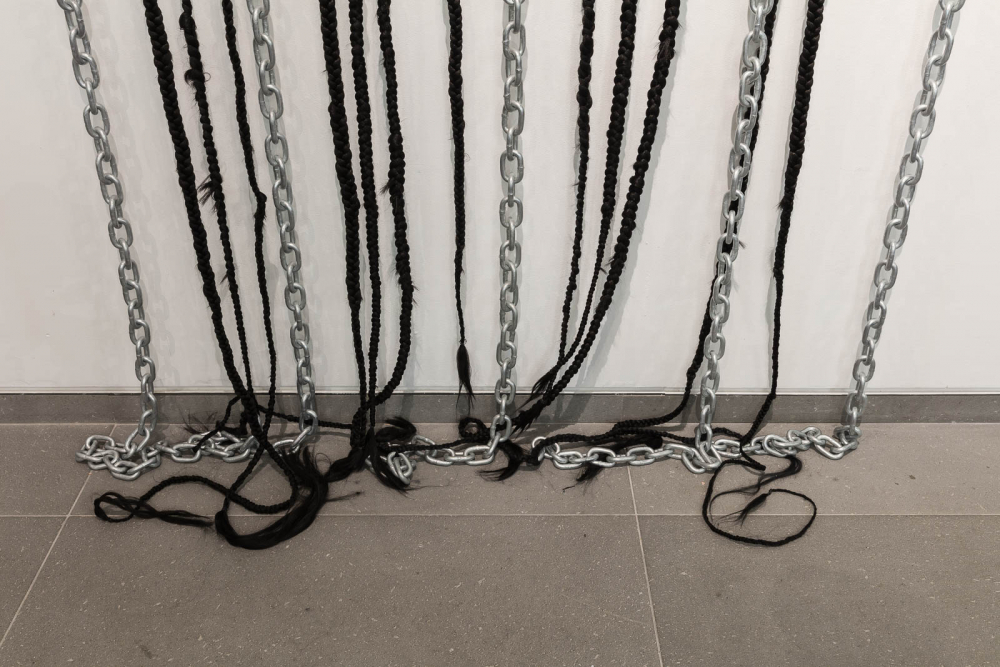 With flower arrangements, cast bronze sculptures, synthetic braided hair locks and chains, dead Daughter alludes to ambiguous traces of memory, race, and domestic life, with a degree of unsettling tension. An excerpt from the artist’s booklet of poetry produced for the exhibition reads: “My resilience of control in this room was found to be disgusting and inflammatory to the voices that taunted.”**