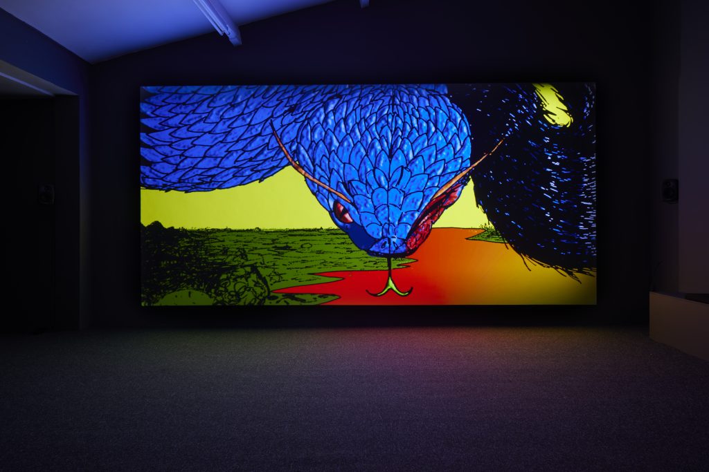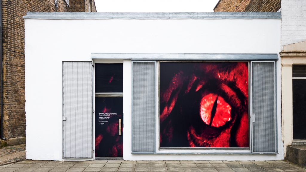 A sense of oneness engulfs Amaru’s Tongue: Daughter. Exploring the earth, time and our position as individuals within it, Chuquimamani-Condori (Elysia Crampton Chuquimia) and Joshua Chuquimia Crampton‘s titular solo exhibition at London’s Auto Italia makes one imagine its invigilators sunk into the darkness, illuminated by a single video installation. Its pulsing, bodily soundtrack is heavy with erratic guitar and thrumming bass, looping on repeat. There is an initial sense of disorientation on entering the show—running September 24 to December 5—followed by something more meditative. A feeling of calm rises alongside emotion, where the US-based Aymaran multidisciplinary artists’ subtle and humorous moving-image work examines the notion of death through the context of individual family narratives and societal histories of resistance.