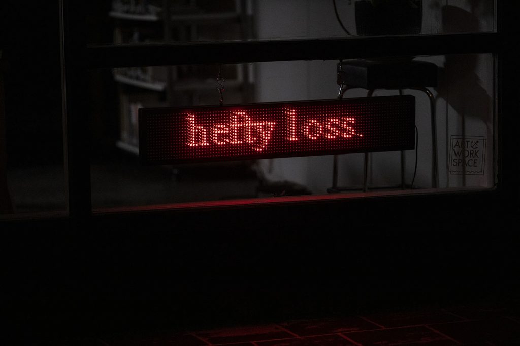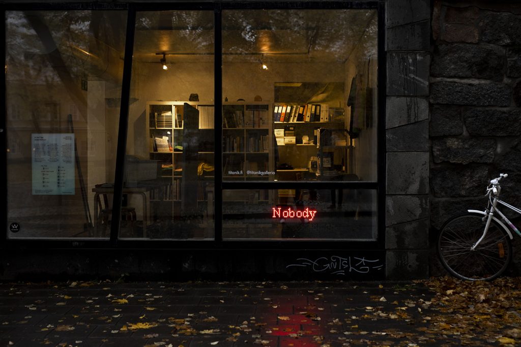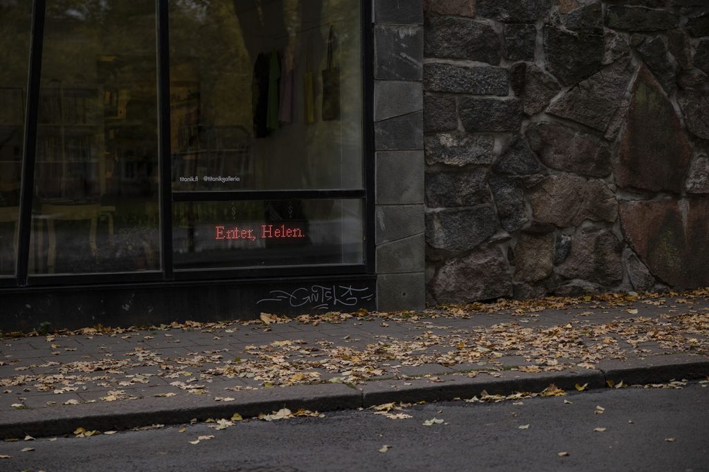 A Bad Sign is a rectangular LED screen in the window of Turku’s Titanik gallery. It has a single line of red writing scrolling from right to left, meeting the reader’s eyes going from left to right. The text is a fragmentary narrative consisting of a pilot and eleven consecutive episodes of poetic text by artist Jessie Bullivant. The piece was commissioned for Weathering, a durational exhibition project about time and weather as agents in making meaning, organised by Katie Lenanton and Bogna Wisniewska, and unfolding through different activities and locations between 2019 and 2022. The screen was turned on between the gallery’s exhibitions throughout the year 2021.