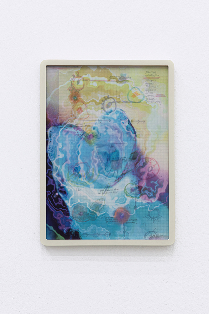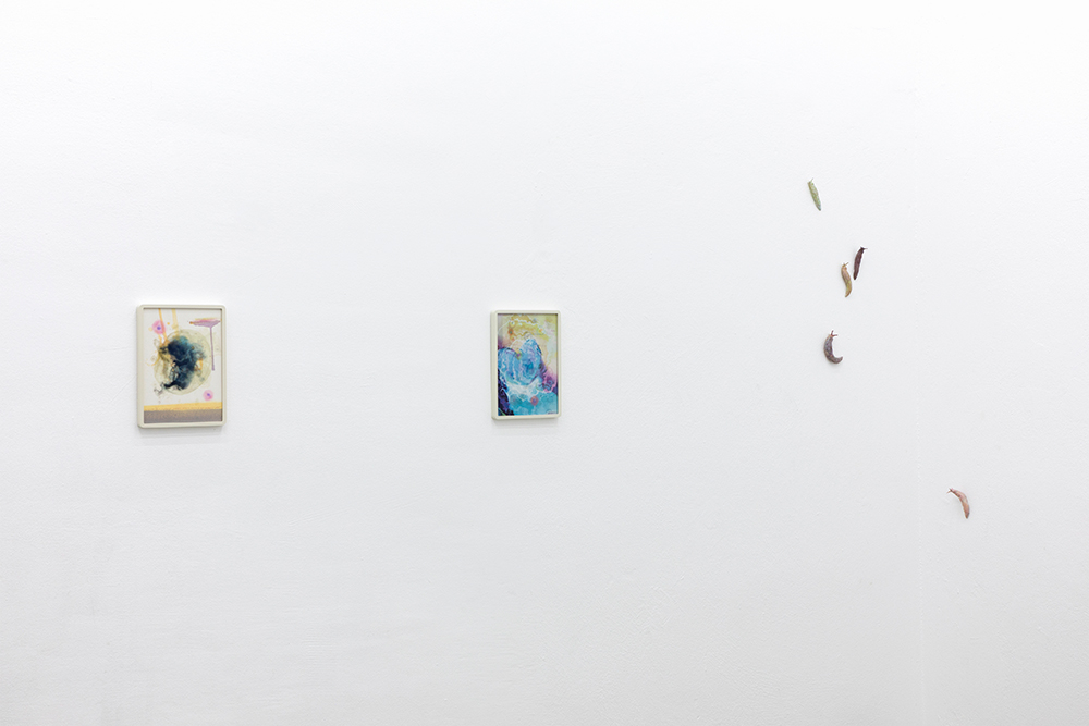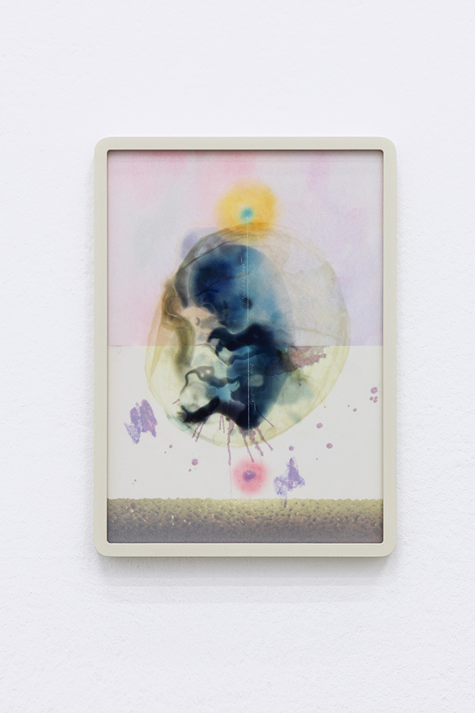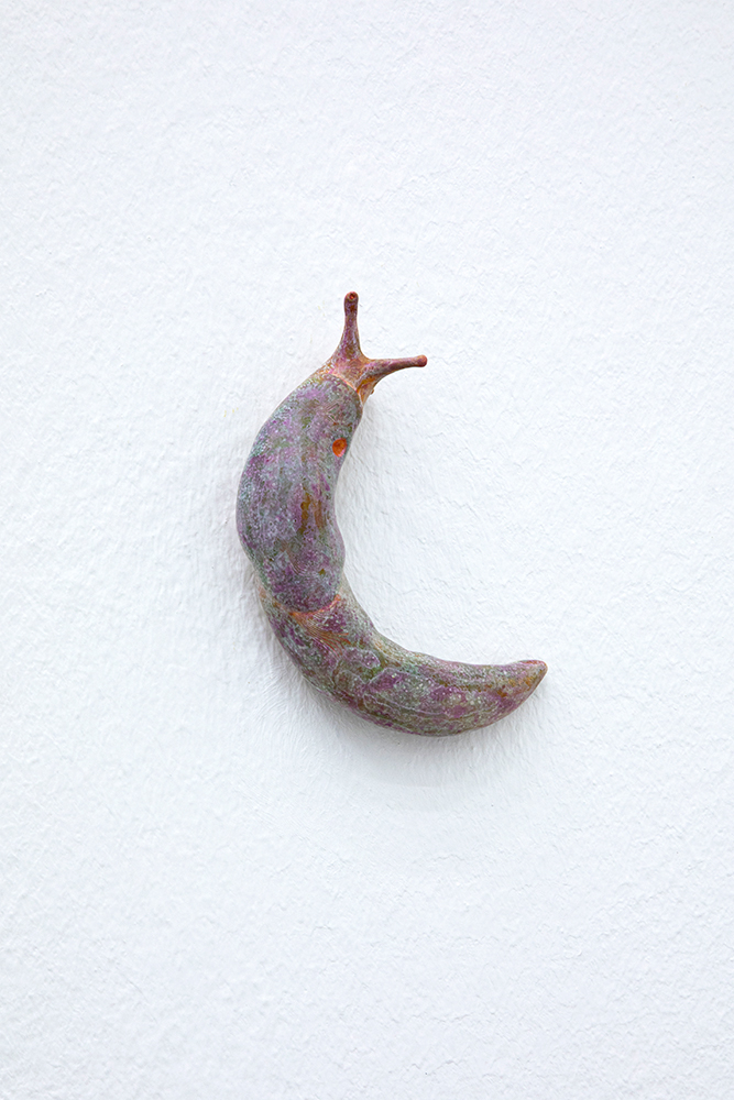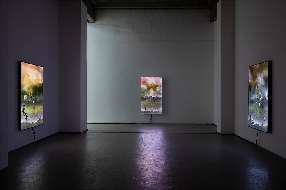 With sculpture, mixed media painting, and animated video, the show evokes embryonic visions and life cycles, with a mix of organic imagery and hyper-coloured dreamscapes. As Adrienne Herr writes in an English and German poem responding to the exhibition: “With Innenwelt we lay energy wie the city träumt die Träume of demoted blaßgraues, the sky and ground exchange purpose.”**