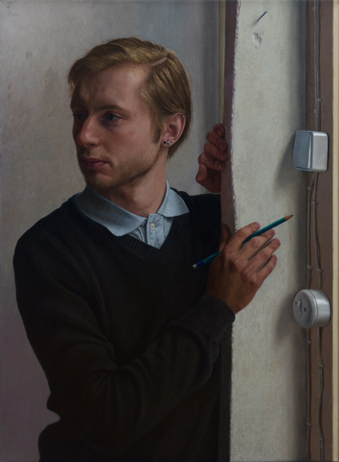 Wim Heldens is a self-taught, professional artist who lives in Amsterdam and whose work has been seen in numerous group and solo exhibitions in Europe and the US. He was a BP Portrait award exhibitor in 2008 and 2010. His sitter is Jeroen, a 25-year-old philosophy student to whom the artist has been a father figure since he was four. He has sat for him over 20 times, and is pictured here leaning on a section of wall with a pencil in his hand wearing the black and grey of which Heldens says, ‘he only seems to be wearing these days’.