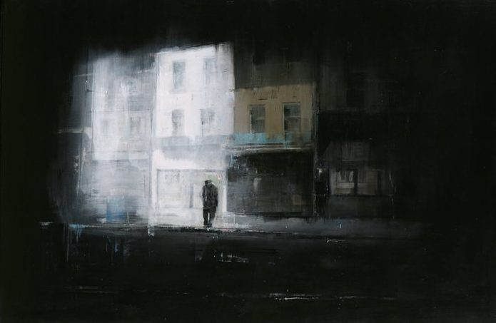 Brett’s works have also evolved over time reducing existing elements of the urban environment and filling the gaps with “negative space”, focusing on the human figures who tend to look like ghosts.
