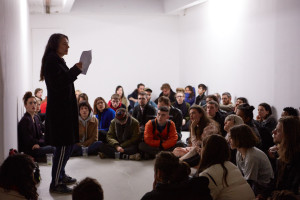 Mira Mattar silently approaches the wall she leans against to speak. She reads two sides of a single piece of paper without averting her gaze from it and without pausing for reaction or effect. The silence Mattar commands is stunning and precious and no one breaks it. She reads like she is under and also performing a spell, but for something/somewhere other than the audience; we watched. The writing is memory, and remembering with occasional marks of self awareness. “I am plotting a solitude that is neither thin escape nor shallow respite,” she says as though she invisibly lifts her head into the present moment –although all of it is read in the present tense –before dipping back into describing, “a silver fish rims sickly the edge of a toilet bowl”.