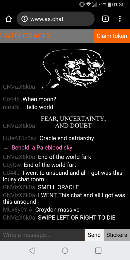 Amnesia Scanner’s recent album Another Life features the voice of Oracle, a software stack processing outsourced vocal work from online freelance marketplace Fiverr, manifesting as the third member of the group. The ‘AS Oracle’ live show introduces this new member across media, as the crowd is invited to join an ad hoc Wi-Fi network with a dedicated chatroom where Oracle is also present during the concert. Usernames are anonymised and anyone in the IM chatroom can share words or Amnesia Scanner-themed stickers, while the ‘chatbot’ Oracle also weighs in. The user base of fans incline the conversation towards self-referential memes, in-jokes, commentary on the music and frequent, transgressive attempts to test the limits of the technosocial construction. Oracle’s responses are in essence a simulation of the Turing test, while the encouragement to look down and stare at one’s phone during Amnesia Scanner’s performance flies in the face of live music convention and adds a new dimension to being present. The group take this idea one step further, triggering the webpage’s background to flash oranges and yellows during particularly intense moments of the music. Through logging in and participating in the chat, the audience inadvertently become proxy strobes for the artists, their phones now lighting fixtures to be weaponised at whim.