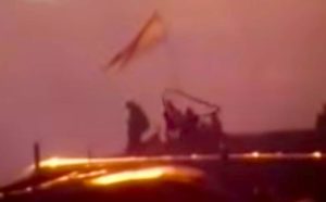 The selection of new works on show is a culmination of Edwards’ time spent during a one-month studio residency at the gallery. The press release is left empty and the accompanying image is pixellated with four figures holding a flag who are rendered abstract.